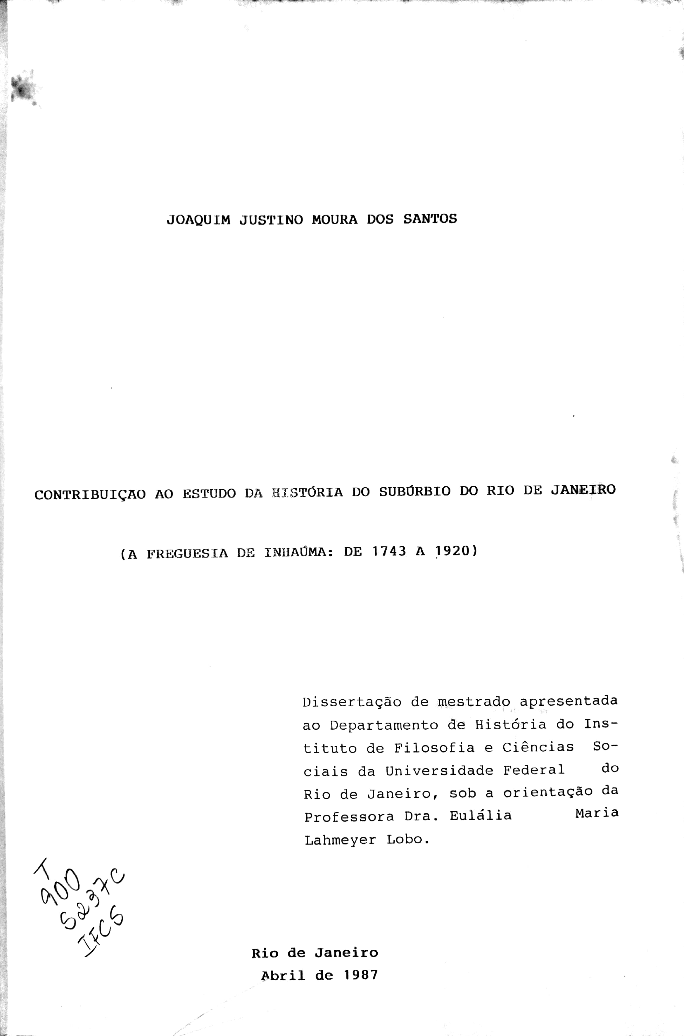 O objetivo deste estudo é a análise das principais transformações ocorridas na vida econômica e social e nas funções desempenhadas pela antiga freguesia de Inhaúma no Rio de Janeiro entre 1743 e 1920. O período em estudo visa abarcar a história de Inhaúma entre sua fundação como freguesia rural do Rio de Janeiro e a sua completa transformação em área residencial proletária nas duas primeiras décadas do século XX. A escolha dessa área de estudo, além de envolver razões afetivas, partiu da percepção através de um trabalho preliminar de que não existem estudos específicos sobre a mesma, apesar de ter sido a freguesia rural, depois suburbana, que mais sofreu transformações econômicas e sociais e em suas funções durante o período do estudado, ao fim do qual tornou-se a mais importante área residencial proletária do município, à medida em que era a mais próxima do centro da cidade. Como hipótese básica supomos que as transformações que se deram em Inhaúma no período que aqui tratamos foram sempre comandadas por diretrizes estabelecidas pelo centro comercial e urbano e não pela oligarquia rural, o que nos leva a considerar que o Rio de Janeiro não esteve ligado a um modelo de cidade patrimonialista. |