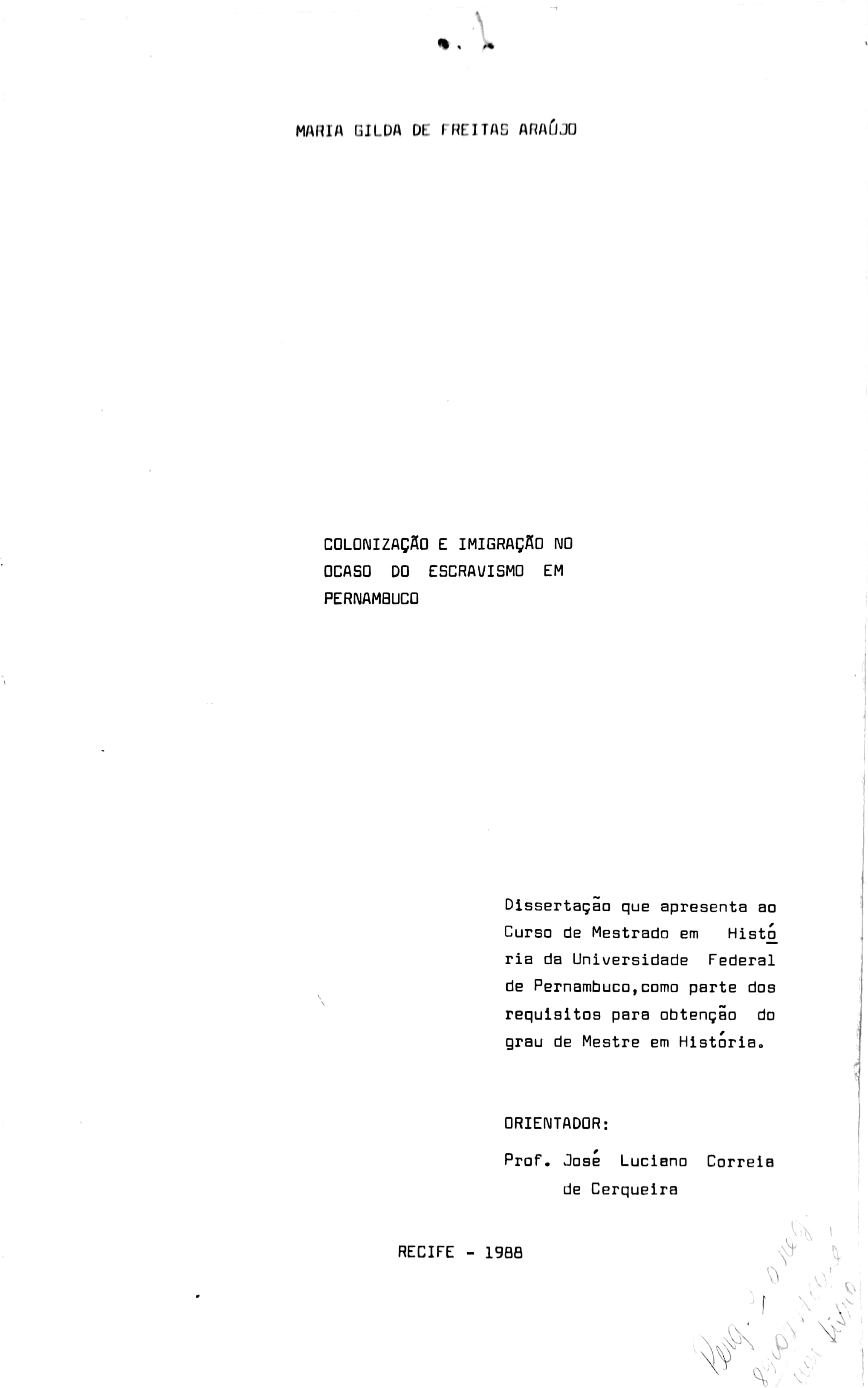 Colonização e Imigração no Ocaso do Escravismo em Pernambuco