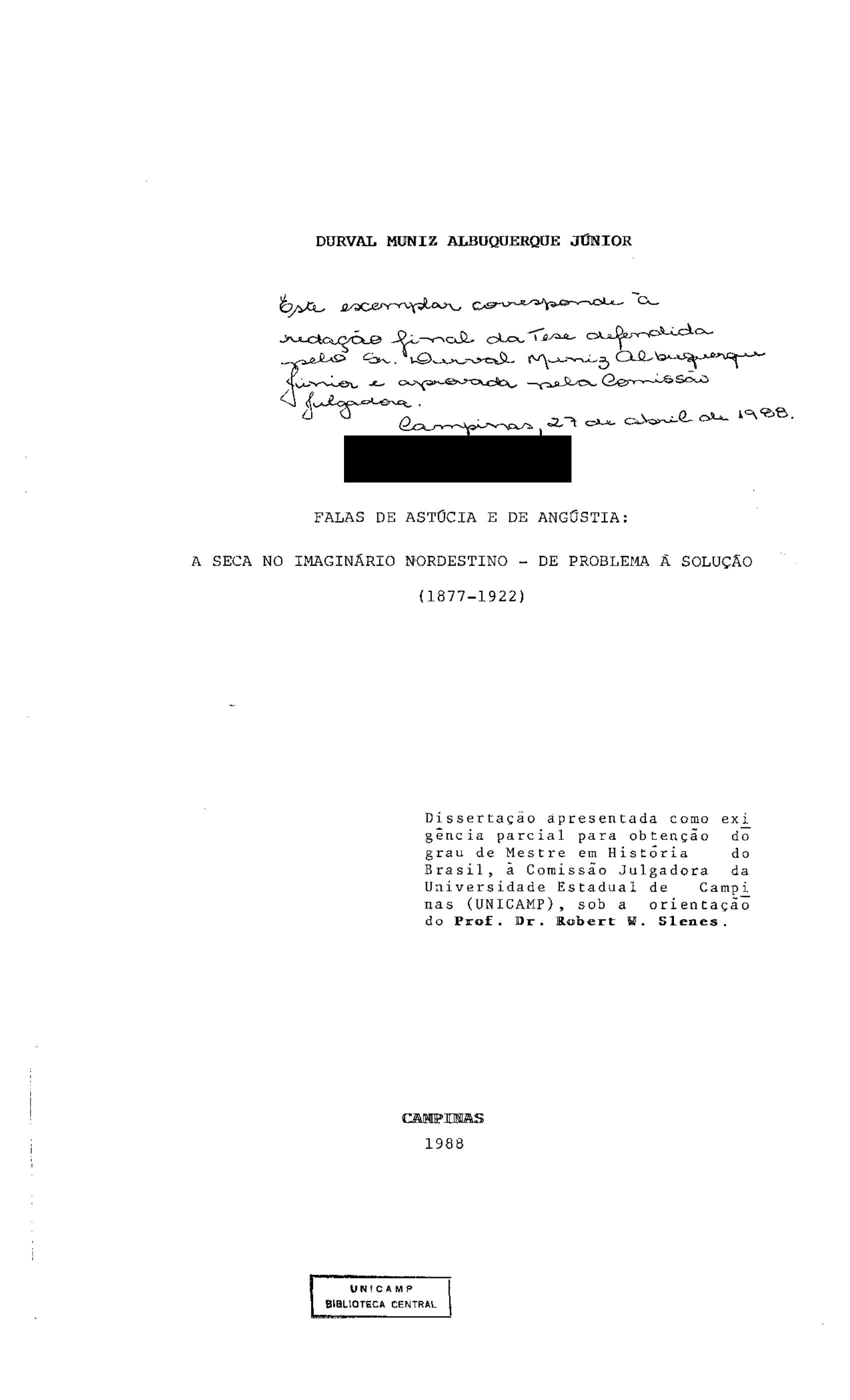 Este trabalho tenta explicar o por quê da seca ter se tornado um problema regional e nacional a partir da grande seca de 1877, quando este fenômeno era secular. Para entender o por quê da problematização da seca neste momento e o seu deslocamento para o centro do discurso regional como o "problema da região", recorremos a uma análise estrutural da sociedade "nortista" neste período, buscando uma explicação para este fato, a partir da conjuntura que a cercou. Tentamos também perceber a formação de um discurso em torno do fenômeno, o "discurso da seca", que a transforma em tema privilegiado e explicação para todos os problemas enfrentados pela região, além de servir de pretexto para reivindicações às mais diversas, desde investimentos na região até a própria manutenção das relações de poder aí presentes. Na constituição do discurso da seca vão se intercruzar vários discursos que se preocupam com o tema, desde o discurso popular até o discurso oligárquico, passando pelos discursos da Igreja, dos técnicos e da "literatura regionalista". Todos irão veicular uma imagem da seca, bem como ligar esta a outros temas de interesse de cada grupo ou instituição social. Estes vários discursos sobre a seca ao se conflitarem darão origem a um discurso outro, o discurso dominante sobre o fenômeno, o "discurso da seca", que não é redutível a nenhum destes em particular. Por fim, procuramos demonstrar as consequências práticas deste discurso, e como estas levam a reformulações táticas e estratégicas no próprio discurso. |