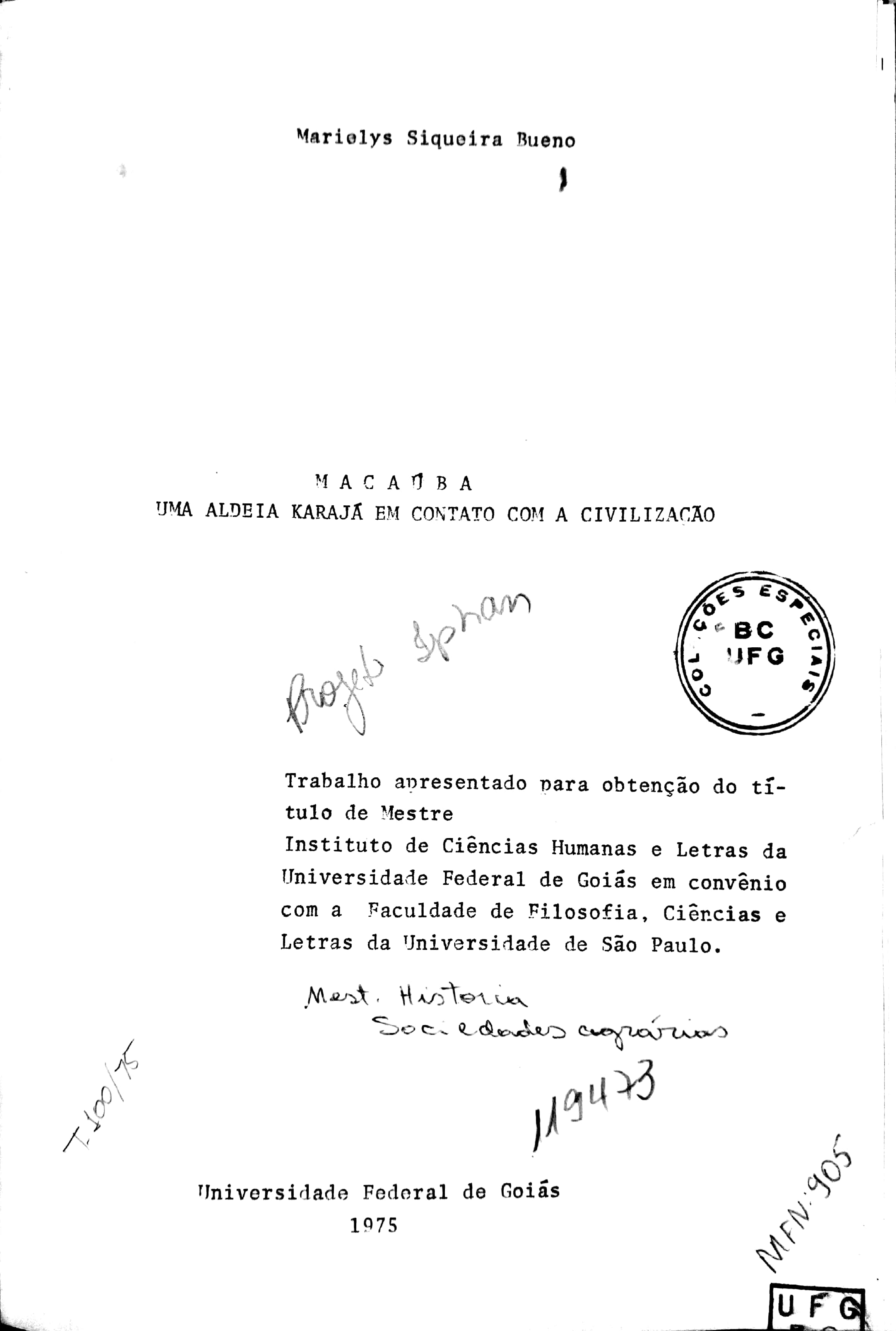 [Pretende inicialmente dar uma visão global da cultura tradicional dos Karajá em confronto com sua situação atual, na categoria de tribo que mantém contato permanente com os civilizados. O objetivo é apenas, fazerem balanço das sobrevivências culturais e ocasionalmente apontar as influências modificadoras, sem se estender à investigação das repercussões desses fatores de conjunção inter cultural, dadas as dificuldades de entender mudanças culturais propriamente ditas engendradas por esse processo. Tendo como de partida a classificação de Darci Ribeiro (1957) que colocou os Karajá entre os grupos de contato permanente com a civilização e alcançados pela frente pioneira de base pastoril, acrescenta-se um outro fator, o turismo, consumidor de produção Karajá, dada a beleza e riqueza do Rio Araguaia. Torna-se como foco do estudo a localidade de Macaúba, uma aldeia "artificial" formada há 40 anos por um grupo de missionários que persuadiu vários grupos desses índios, especialmente de aldeamentos menores, a mudarem-se para esse lugar, situado na Ilha do Bananal.] |