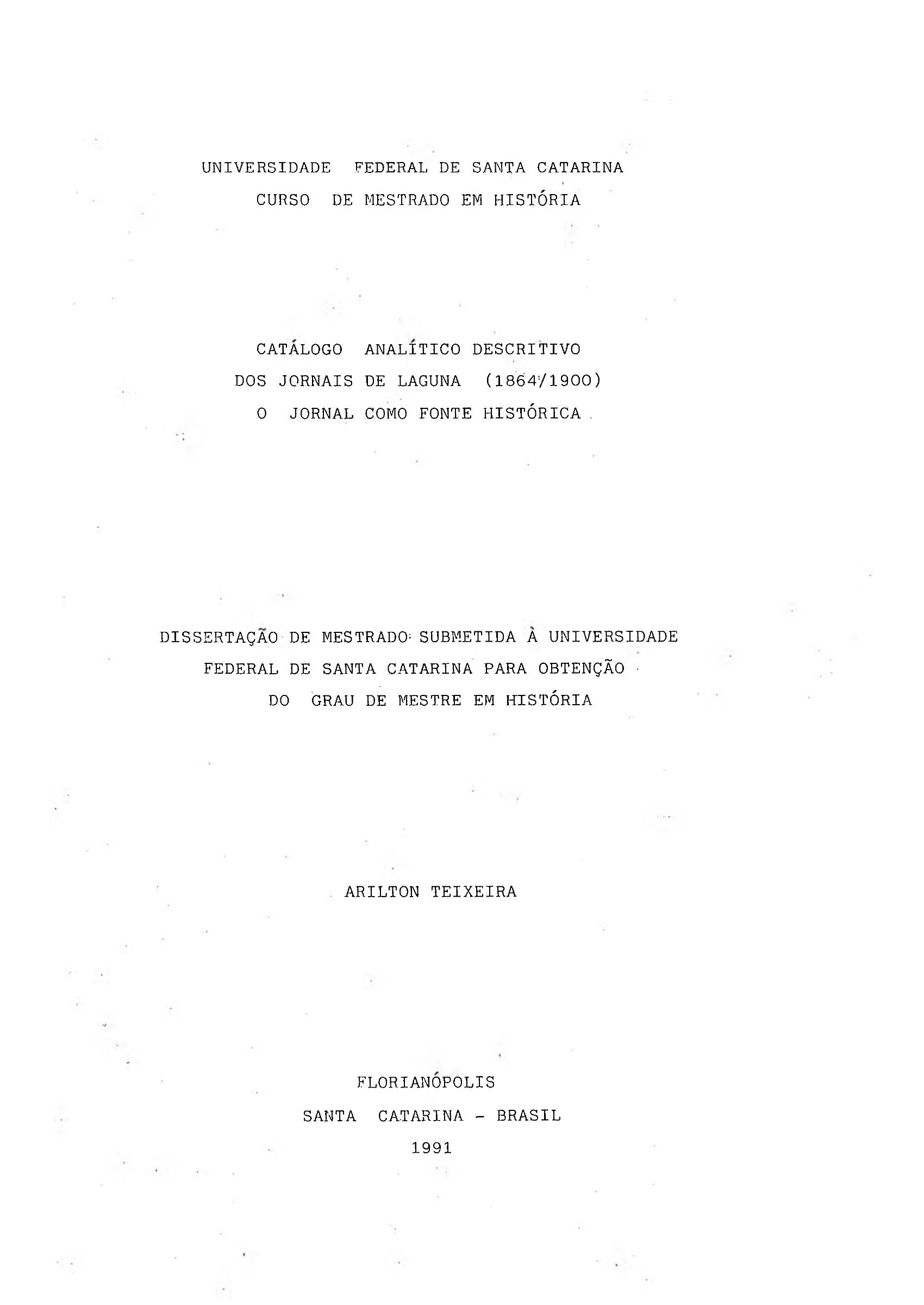 O presente trabalho constitui um levantamento catalográfico, analítico descritivo da Imprensa da cidade de Laguna. Ele se enquadra dentro do projeto histórico de levantamento global da imprensa catarinense, desde as origens até os dias atuais e que, já tem realizado três dissertações nesta Pós-Graduação de História, anteriormente apresentadas por mestrandos do curso. A análise sintética das características da imprensa lagunense no período de 1864/1900, através de fichas catalográficas, estabelece um fundo documental possibilitando futuras pesquisas. Apresenta aspectos como: circunstâncias publicitárias, a titulação dos jornais, a periodicidade e as características gerais e tipográficas onde ressalta: o formato, a paginação e o número de colunas. Bem como aspectos da vida política, sócio-econômica e cultural local, regional e até nacional. Destaca ainda os fatos históricos que refletiram com maior ou menor incidência na vida dos cidadãos lagunenses e catarinenses, no lapso cronológico deste trabalho. Insere-se nesta dissertação, mapas de Santa Catarina, da cidade de Laguna e quadros demonstrativos de diversos aspectos importantes, bem como, algumas fotografias ilustrativas que enriquecem significativamente nosso trabalho. |