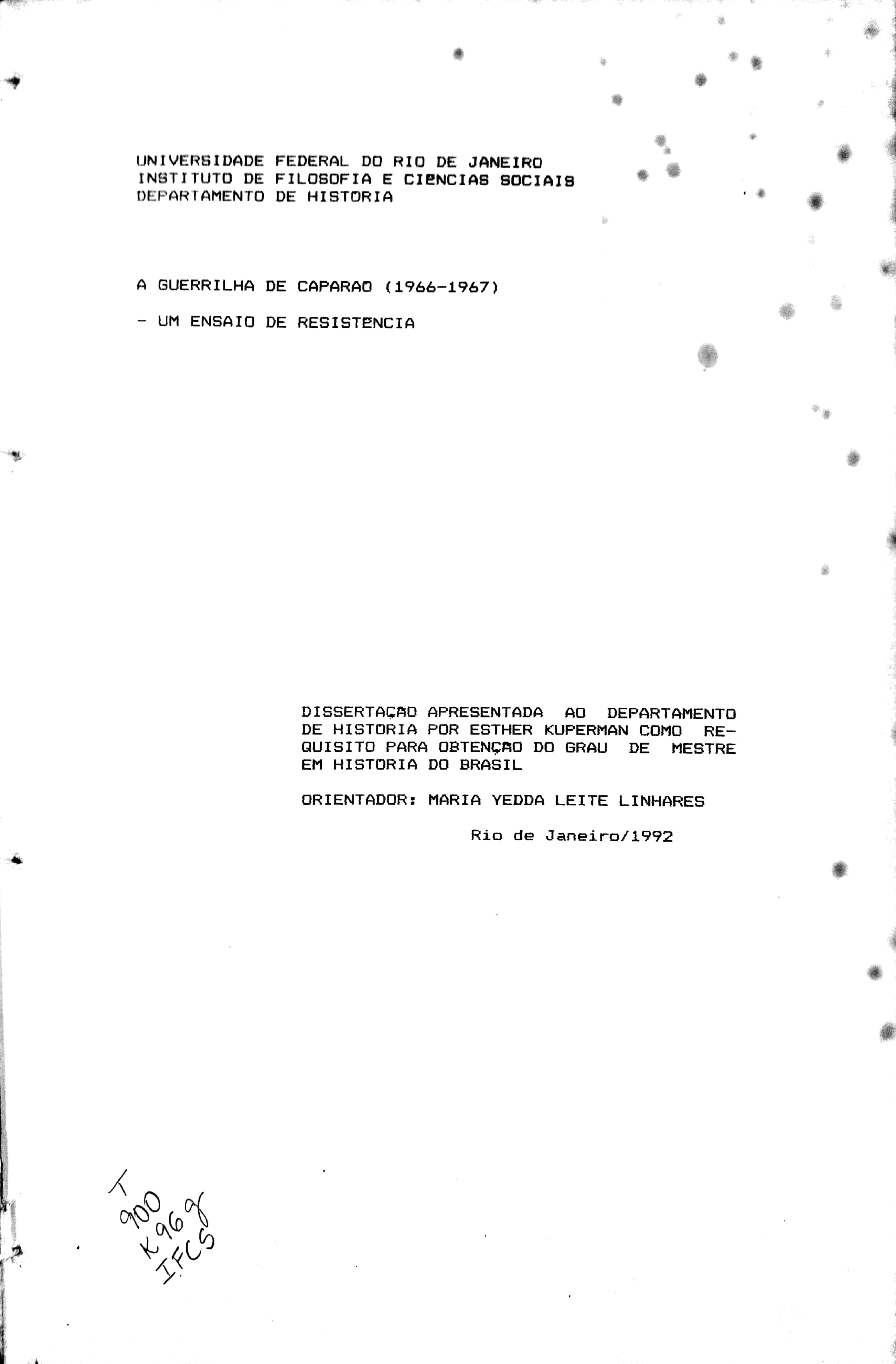 Este estudo trata dos movimento políticos de resistência ao regime estabelecido no Brasil a partir de março de 1964. Partindo da análise da conjuntura política, econômica e social existente no país durante a década de 1960, foram examinadas e confrontadas as ideias defendidas entre os militares e as ideias que os diversos grupos da esquerda brasileira produziam sobre o momento em questão. A partir do confronto entre as duas visões, e detectada a origem das propostas de ação política que levam a resistência armada por parte das esquerdas, enfocando o caso do primeiro movimento em que é levada adiante a ação armada: a Guerrilha de Caparaó. A montagem e o desenvolvimento desta guerrilha são analisados, tendo em vista seu papel histórico. São identificados seus militantes, bem como o caráter da atuação do grupo guerrilheiro, desde sua organização, em novembro de 1960, até a captura, em abril de 1967. |