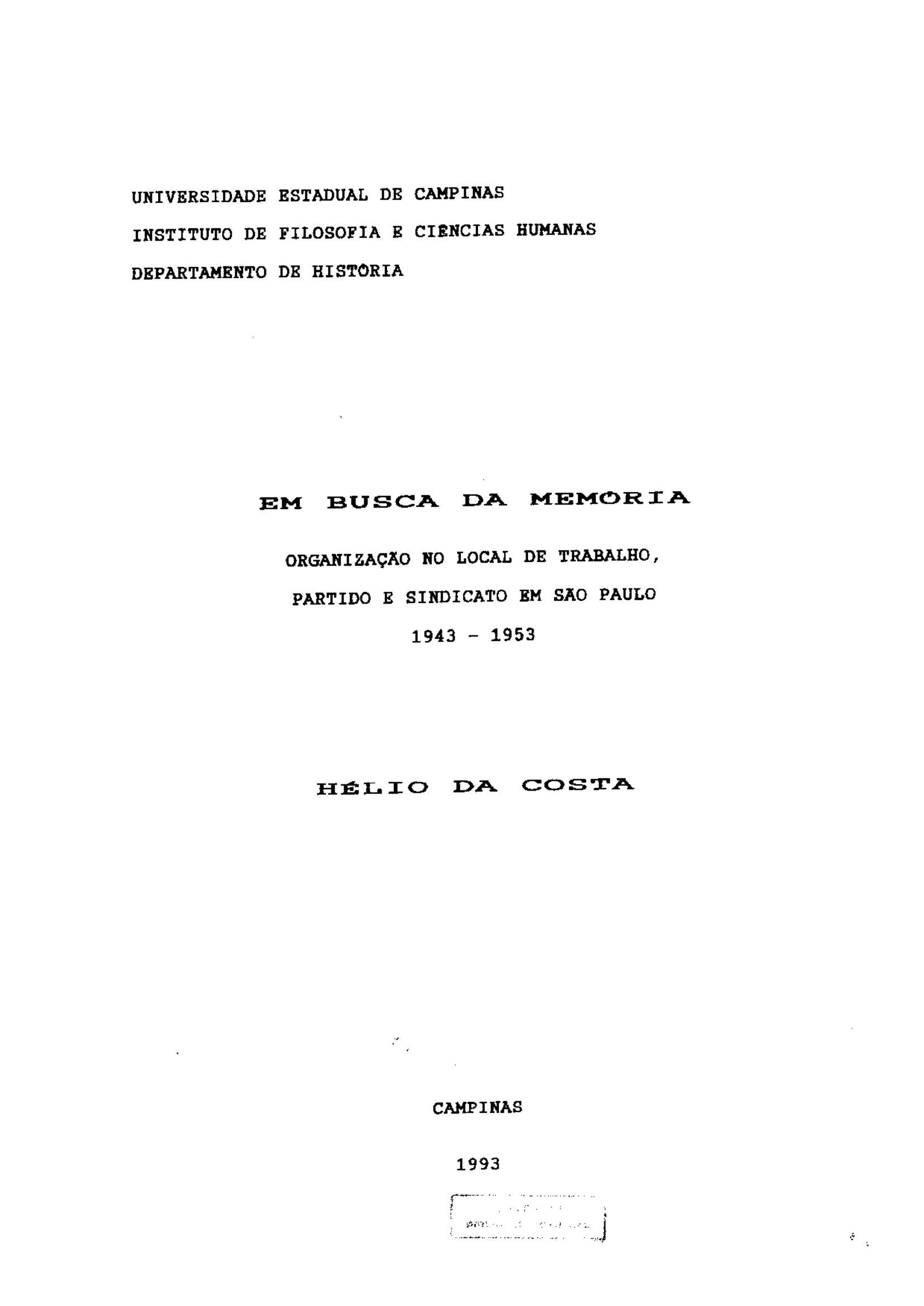 Em Busca da Memória: Organização no Local de Trabalho, Partido e Sindicato em São Paulo - 1943-1953