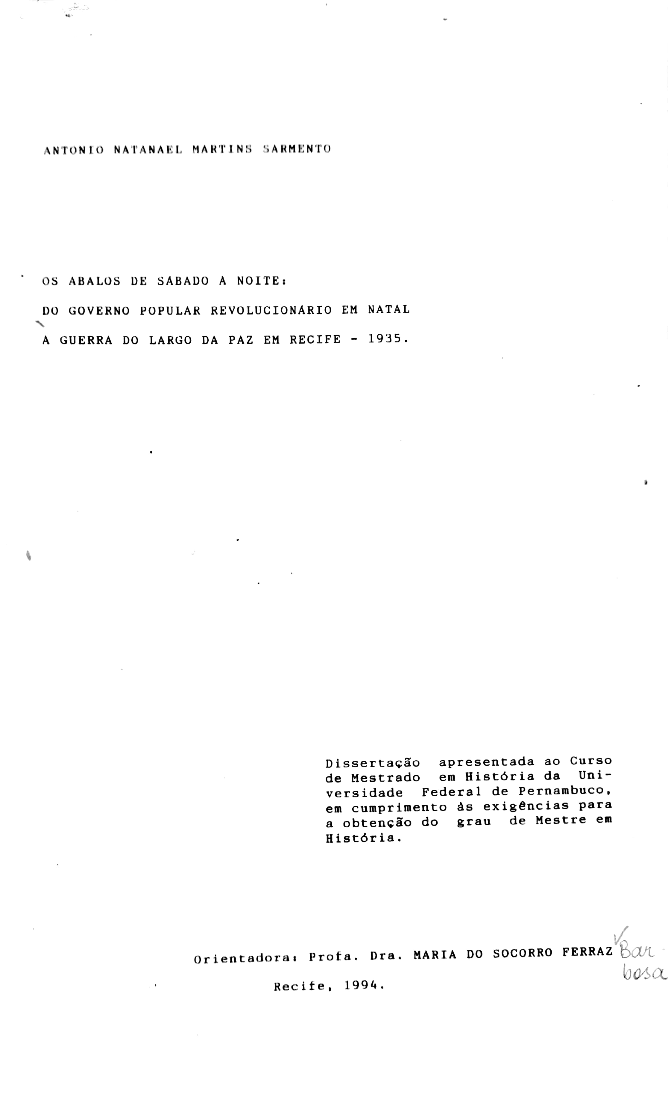 Antonio Natanael Martins Sarmento (Orientador: Maria do Socorro Ferraz Barbosa)