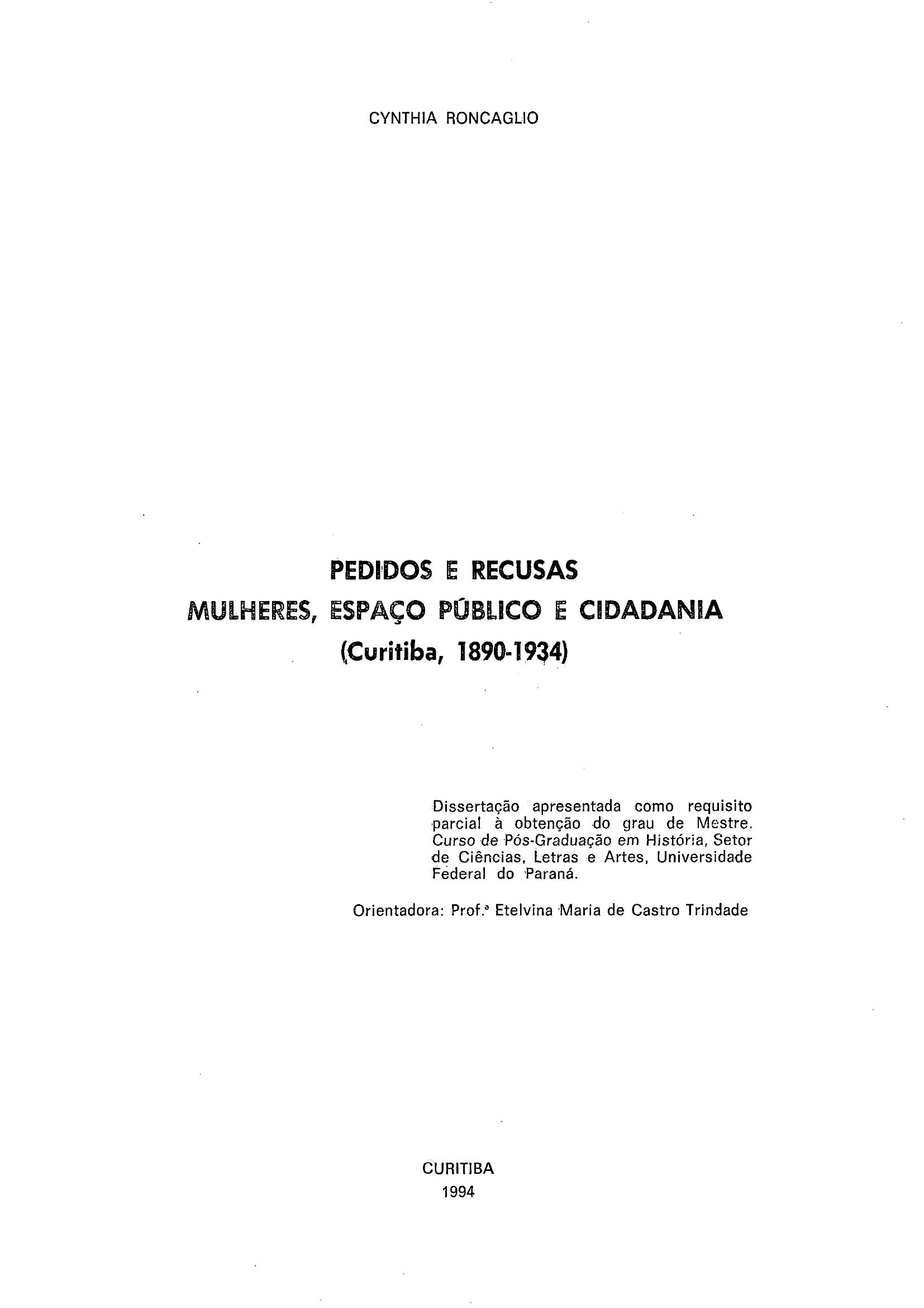 Pedidos e Recusas: Mulheres, Espaço Público e Cidadania (Curitiba, 1890-1934)
