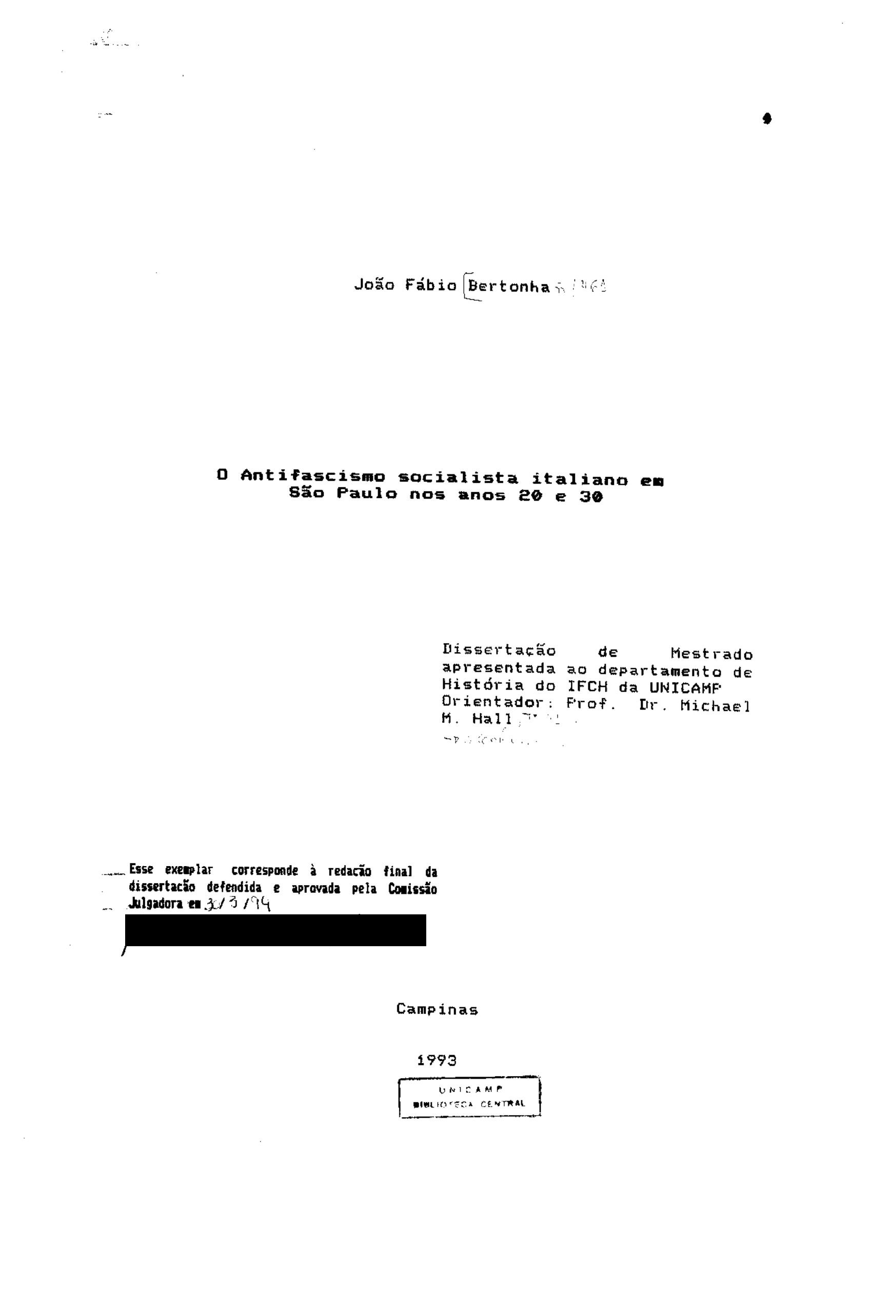 João Fábio Bertonha (Orientador: Michael McDonald Hall)