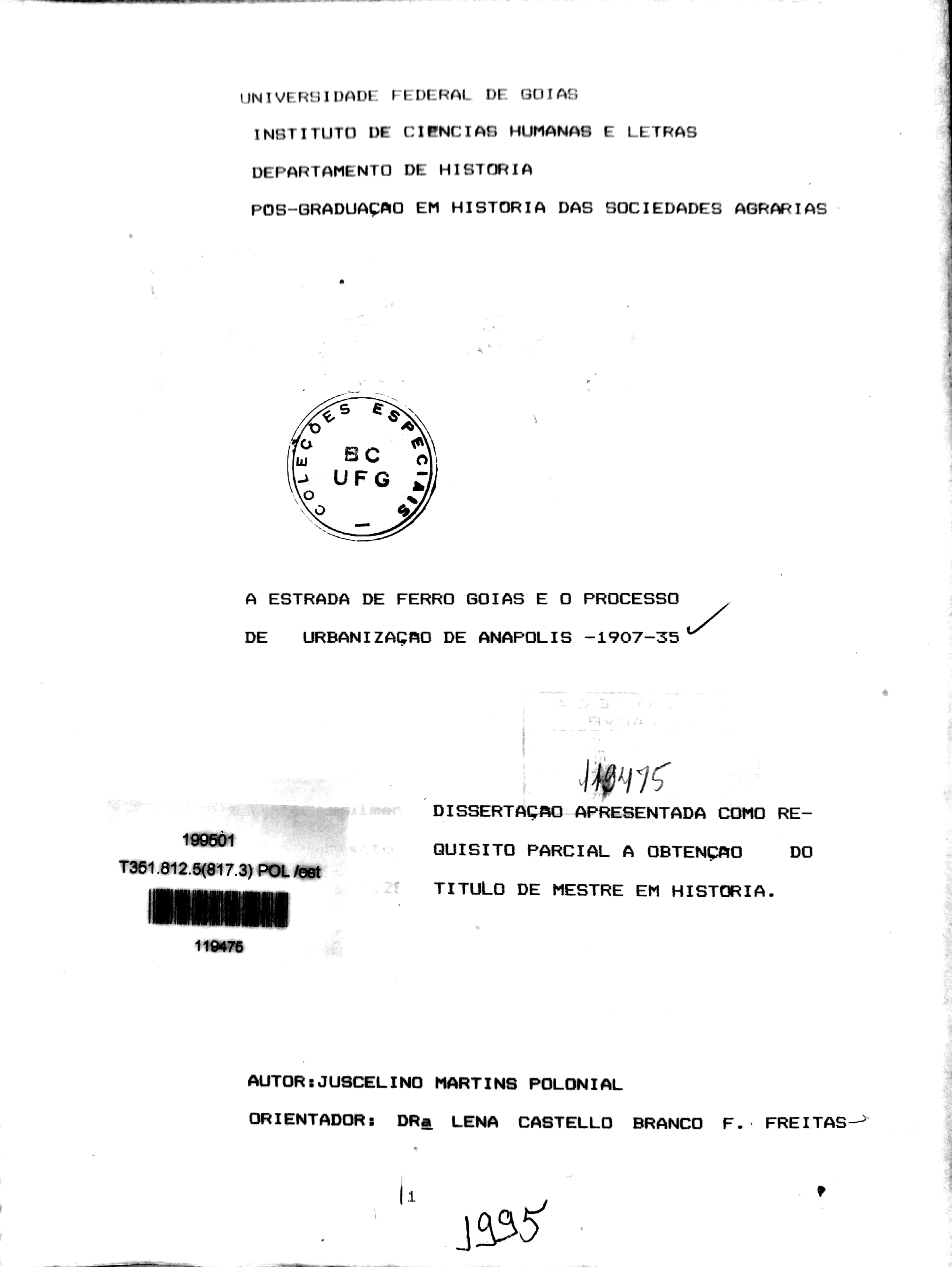 Estuda-se as alterações econômicas, sociais, políticas, urbanas e culturais em Anápolis com a chegada da estrada de ferro em 1935. O período investigado é de 1907, quando Anápolis é elevada à condição de cidade, à 1935, quando foi inaugurada a estação ferroviária de Anápolis. Nessa fase, analisada como a cidade se preparou para receber a estrada de ferro, e as mudanças operadas no setor econômico, social, político e cultural, envolvendo o setor urbano. São apontados dados dos anos seguintes à chegada da ferrovia, como forma de confirmar a nossa hipótese de trabalho, que aponta a estrada de ferro como a grande responsável pelas transformações mais gerais por que passou a cidade. Houve maior dinamismo econômico, determinando uma influência na região, e no quadro urbano local. Relaciona-se as mudanças ocorridas no período com as transformações mais gerais do capitalismo, quando o imperialismo britânico entra em crise, sendo o vazio ocupado dos Estados Unidos. Tem-se, então, a passagem da Era Ferroviária para a Era Rodoviária. Isso afetará a economia anapolina, conforme análise no texto. |