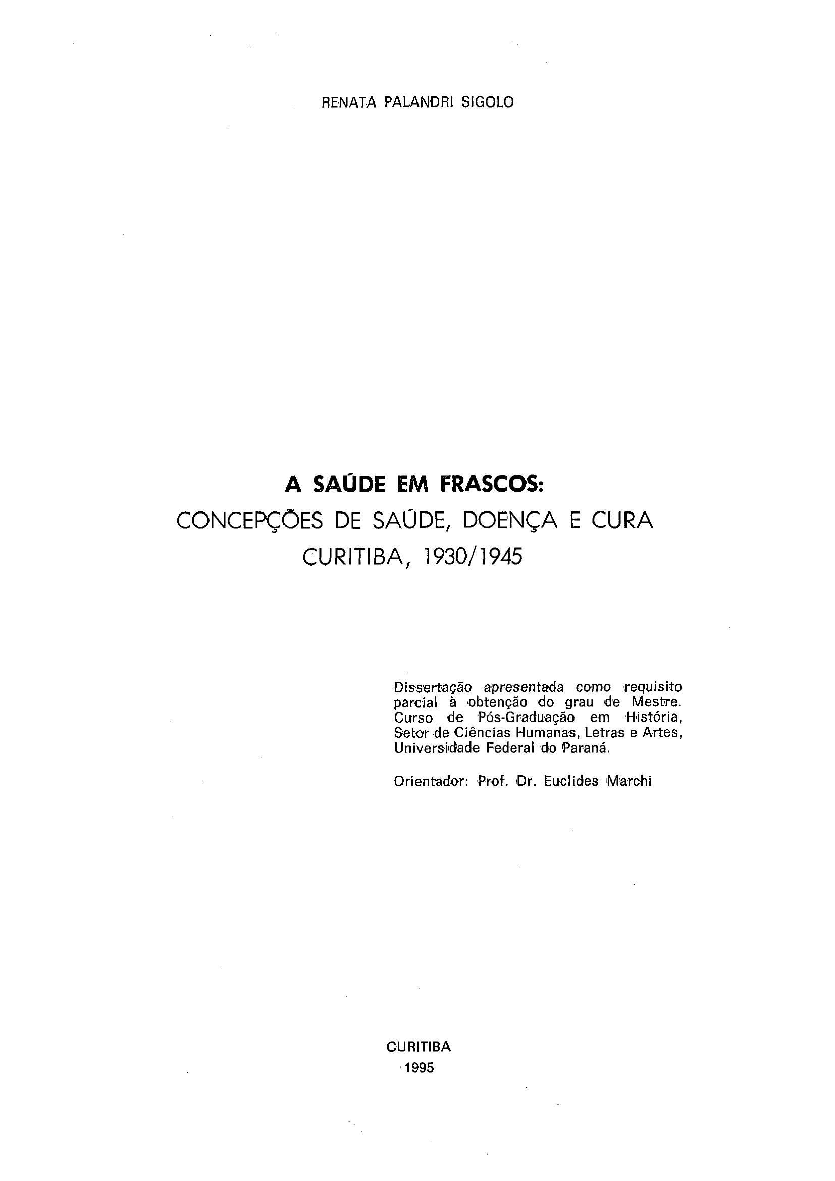 A Saúde em Frascos: Concepções de Saúde, Doença e Cura. Curitiba, 1930/1945