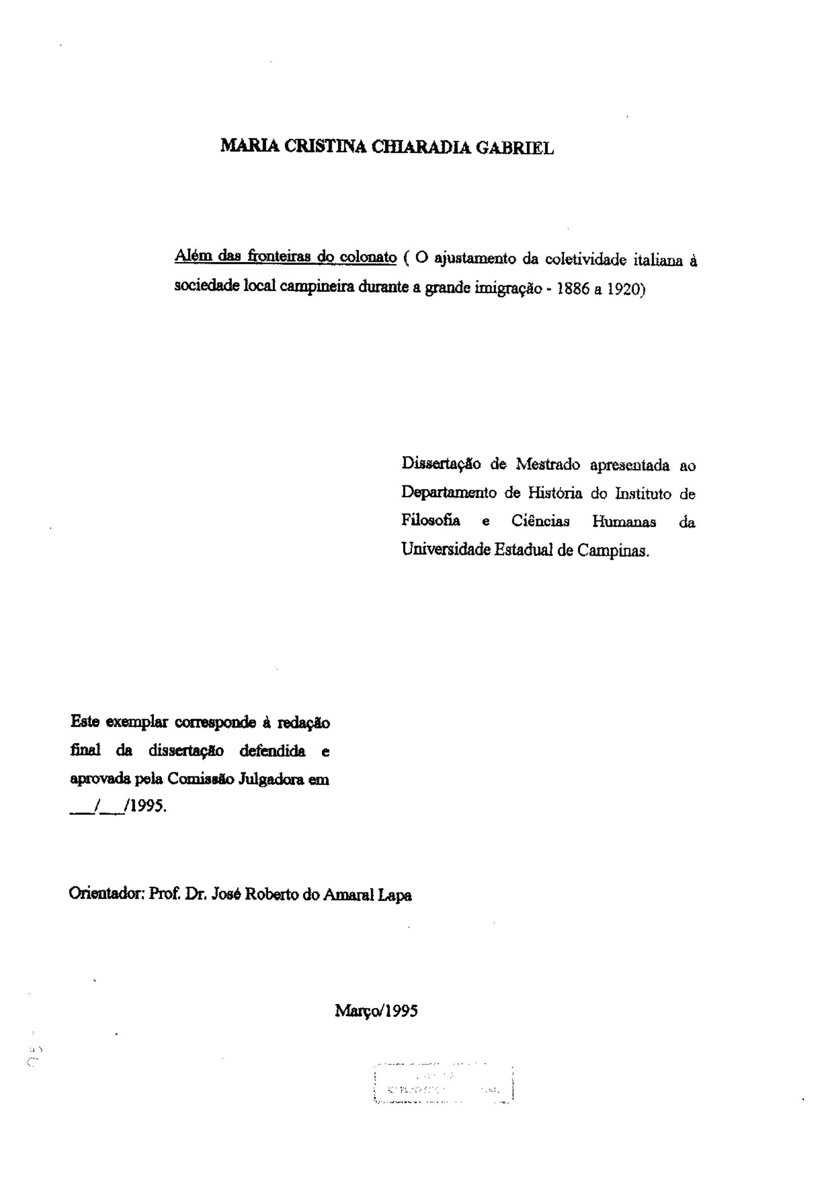 Maria Cristina Chiaradia Gabriel (Orientador: José Roberto do Amaral Lapa)