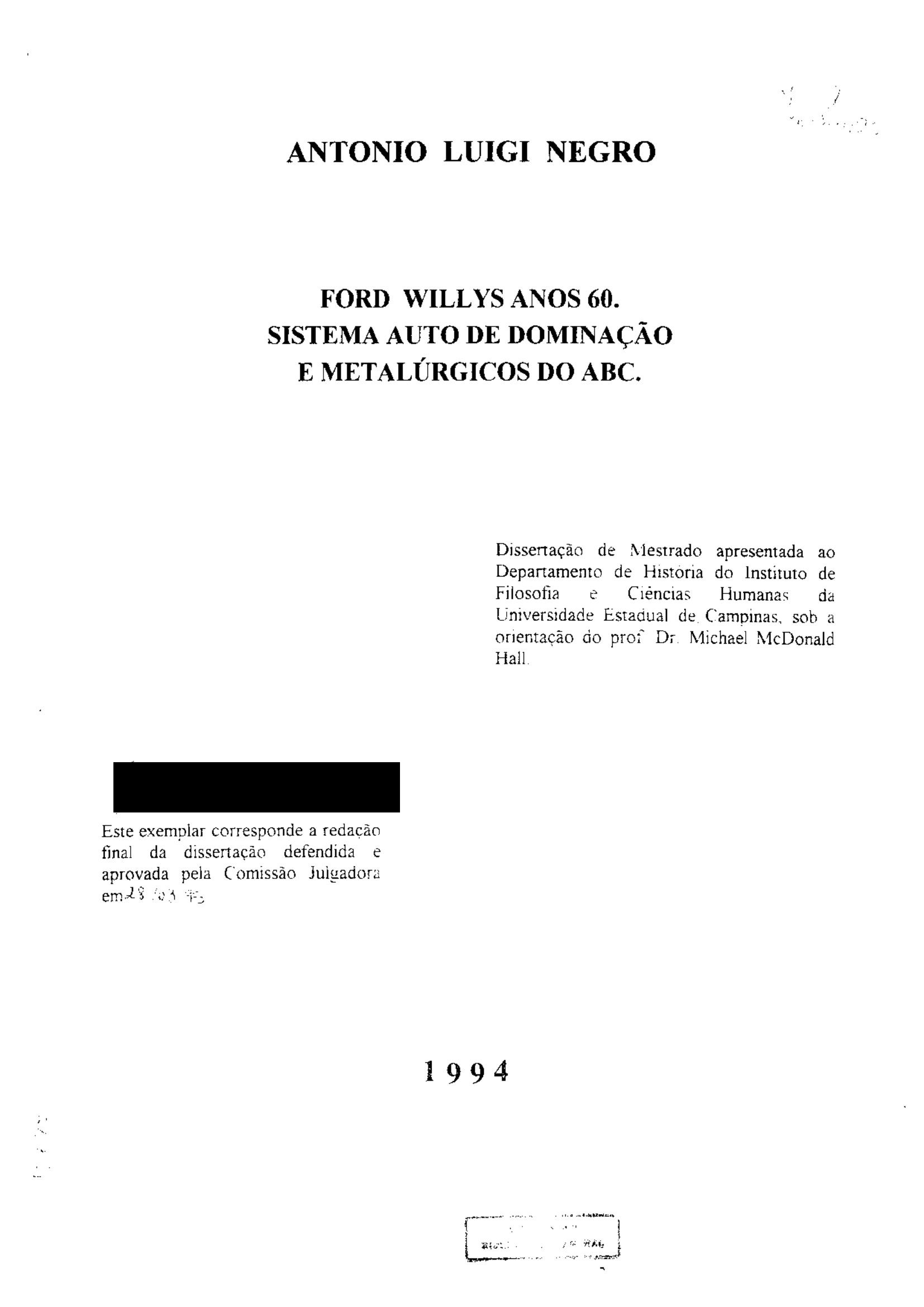 Ford Willys Anos 60. Sistema Auto de Dominação e Metalúrgicos do ABC