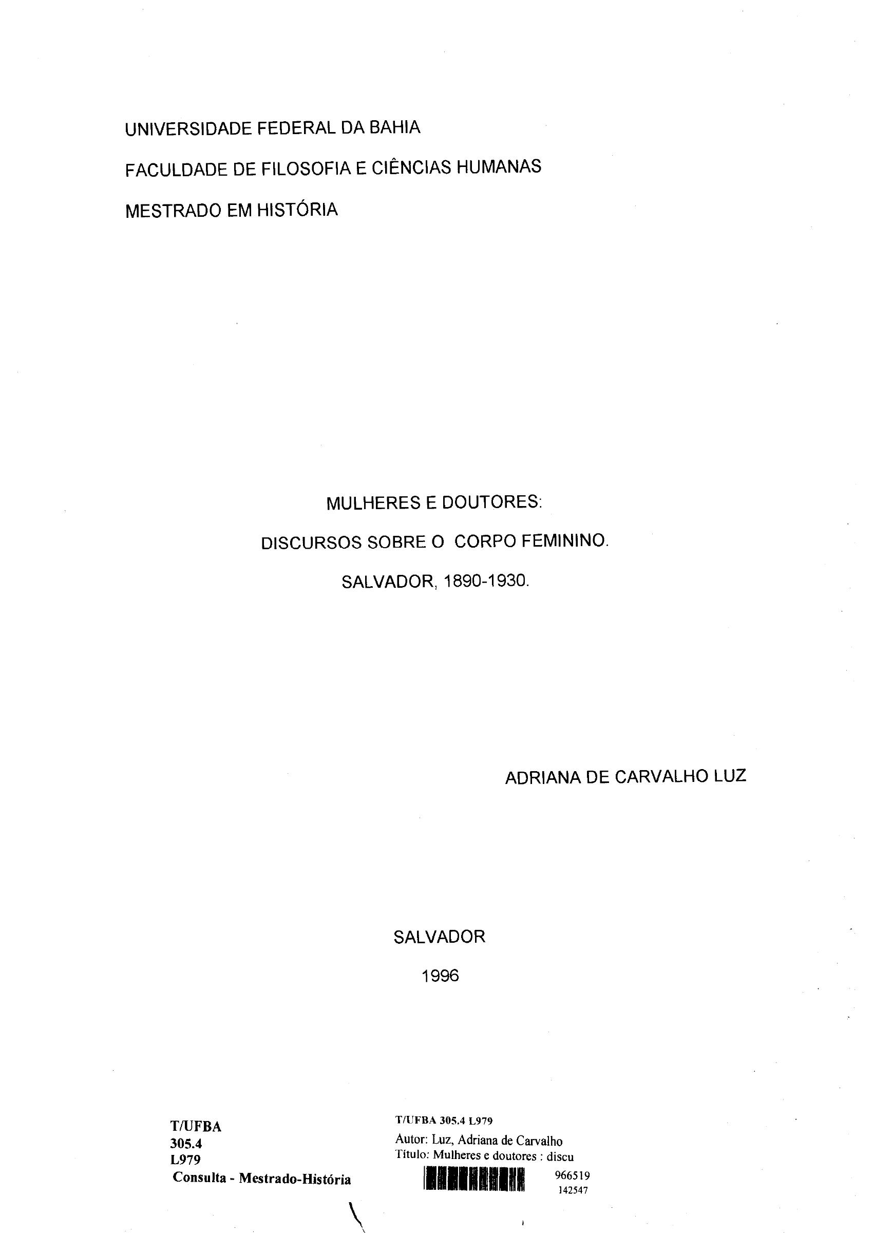 Mulheres e Doutores: Discursos sobre o Corpo Feminino. Salvador, 1890-1930