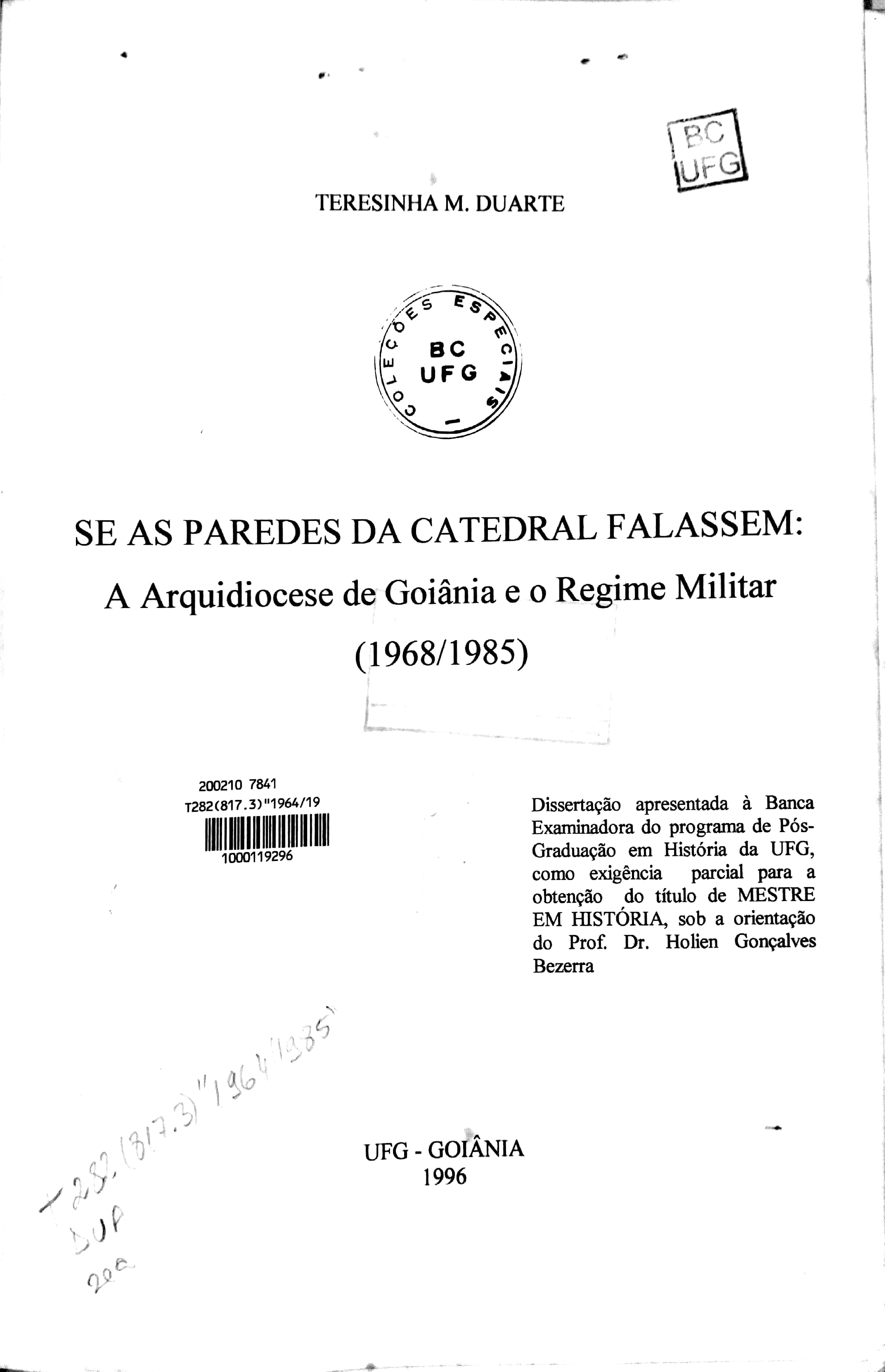 A pesquisa teve como objetivo reconstruir a História das relações entre a Arquidiocese de Goiânia e o regime militar no período de 1968 a 1985. A problemática foi o questionamento das razões que levaram a Igreja de Goiânia a aderir ás aspirações populares, opondo-se ao regime. As relações entre a Arquidiocese de Goiânia e o regime militar foram marcadas por tensões: a resistência, baseada em valores éticos e morais, por parte da Igreja. O estudo baseou-se na análise histórica e utilizou, sempre que possível, sugestões oferecidas pela análise do discurso. Como o objetivo de estudo fosse um tema da História da Igreja, foram utilizadas contribuições de ciências afins. As fontes foram: a Revista da Arquidiocese, escritos de Dom Fernando, Documentos da Igreja e o jornal Folha de Goiáz. A metodologia adotada foi a análise do discurso de Dom Fernando Gomes dos Santos e de seus colaboradores, como resistência ao regime. Fazendo um contraponto com a fala do Arcebispo, foram analisados discursos de políticos e pareceres da Imprensa, contidos no jornal Folha de Goiáz. Foram encontrados três eixos de discussão, responsáveis pelos três capítulos do trabalho: "Desenvolvimento: um projeto em debate", "Justiça e Direitos Humanos"e "Controvérsias". A Igreja do Brasil já participava de projetos de desenvolvimento antes do advento do regime militar, mas a instituição amadureceu o conceito de "desenvolvimento integral"entre os anos de 1965 e 1968, o que tornou fator de conflito com o regime militar que teve a concepção de desenvolvimento como crescimento econômico. A Arquidiocese de Goiânia optou por um projeto eclesial baseado na luta pela justiça, na defesa dos direitos humanos e na inserção nos movimentos populares. Isto foi um ponto de controvérsias, acirrando o conflito com o regime militar e abrindo um espaço para a politização, no interior da instituição. |