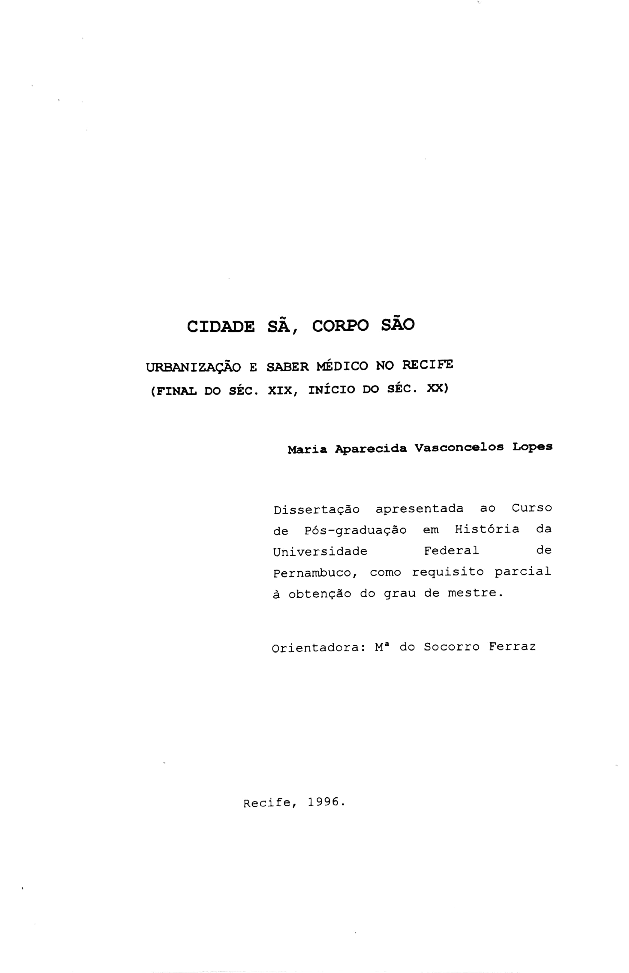 Cidade Sã, Corpo São: Urbanização e Saber Médico no Recife (Final do Séc. XIX, Início do Séc. XX)
