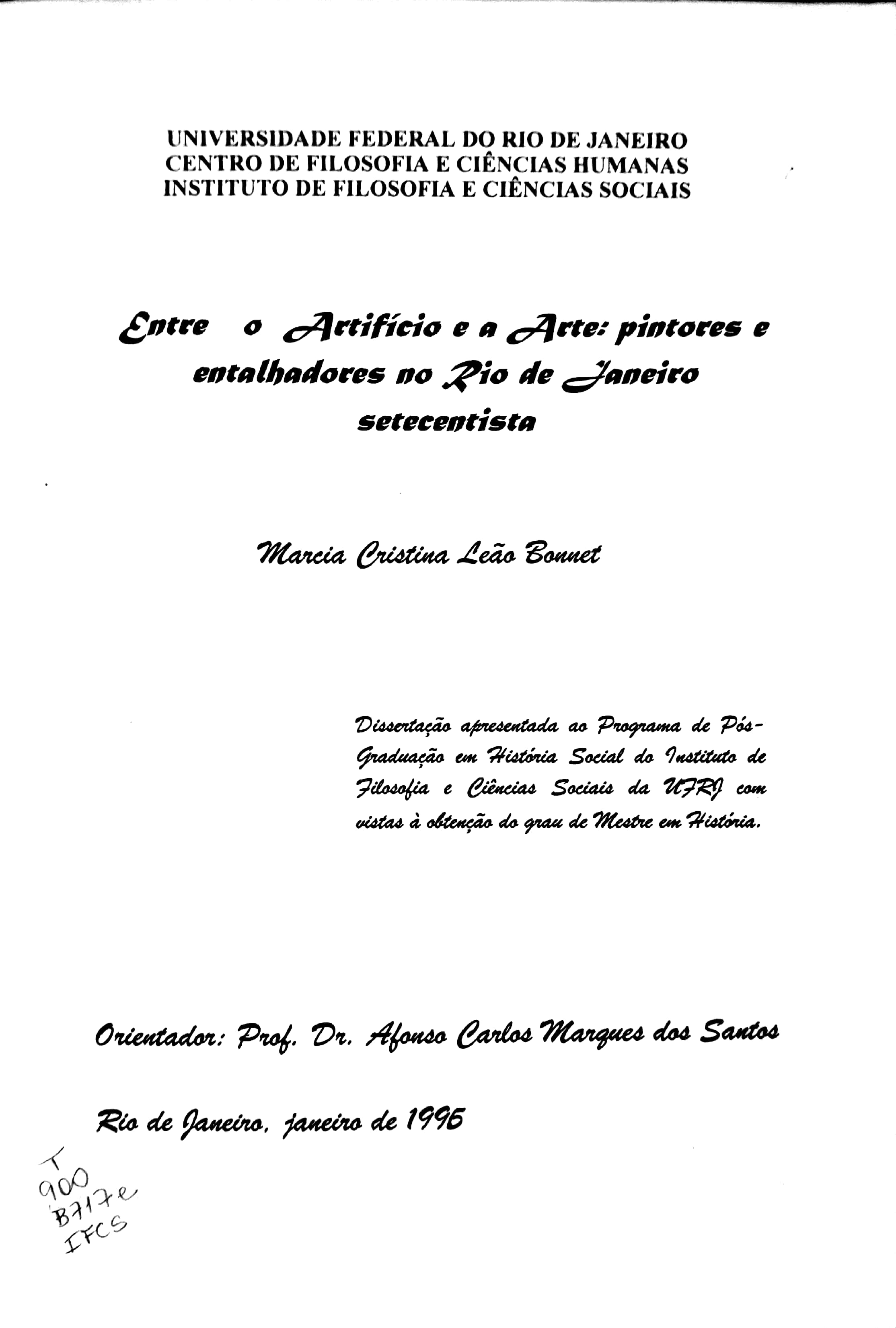 Os pintores e entalhadores que produziram no Rio de Janeiro entre os anos de 1700 e 1808 constituem o tema central deste estudo. Utilizando como foco privilegiado a produção artística limitada a esfera religiosa buscou-se compreender o estatuto social e profissional destes artífices na sociedade colonial fluminense. O trabalho se apoia no entrecruzamento de fontes de tipologias diversas como livros de registro de irmandades, ordens terceiras, conventuais e monásticas, registros paroquiais de batismo, casamento e óbito, processos de casamento, inventários post-mortem e ações de litígio. A utilização destas fontes procura obedecer a uma lógica que parta da análise do particular para o coletivo, com ênfase no universo individual destes homens, sem perder de vista, entretanto, o conjunto de artífices e a sociedade em que se insere. |