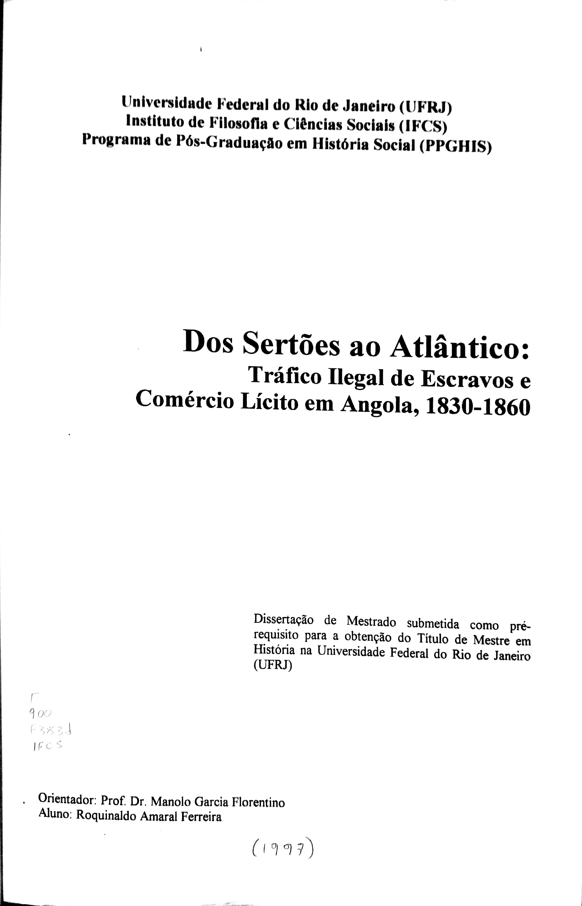 Esta dissertação discute o tráfico ilegal de escravos e o comércio lícito em Angola entre 1830 e 1860. Diante da repressão crescente neste período a organização do tráfico ilegal sofreu grandes transformações. Novas estratégias mantiveram o tráfico ilegal ativo no congo-Angola até que taxas de risco intoleráveis o inviabilizassem. A partir daí os negociantes de Luanda optaram pelo comércio lícito abandonando a estratégia de diversificar investimentos. Com o fim do tráfico ilegal a escravidão assumiu importância maior na economia de Angola. Os corolários disto foram o aumento das fugas e revoltas de escravos. Em Luanda o colapso do comércio a partir do mecanismo adiantamento-endividamento de mercadorias para os sertões atingiu mais fortemente os grandes negociantes que o próprio fim do tráfico ilegal de escravos com o Brasil em 1850. |