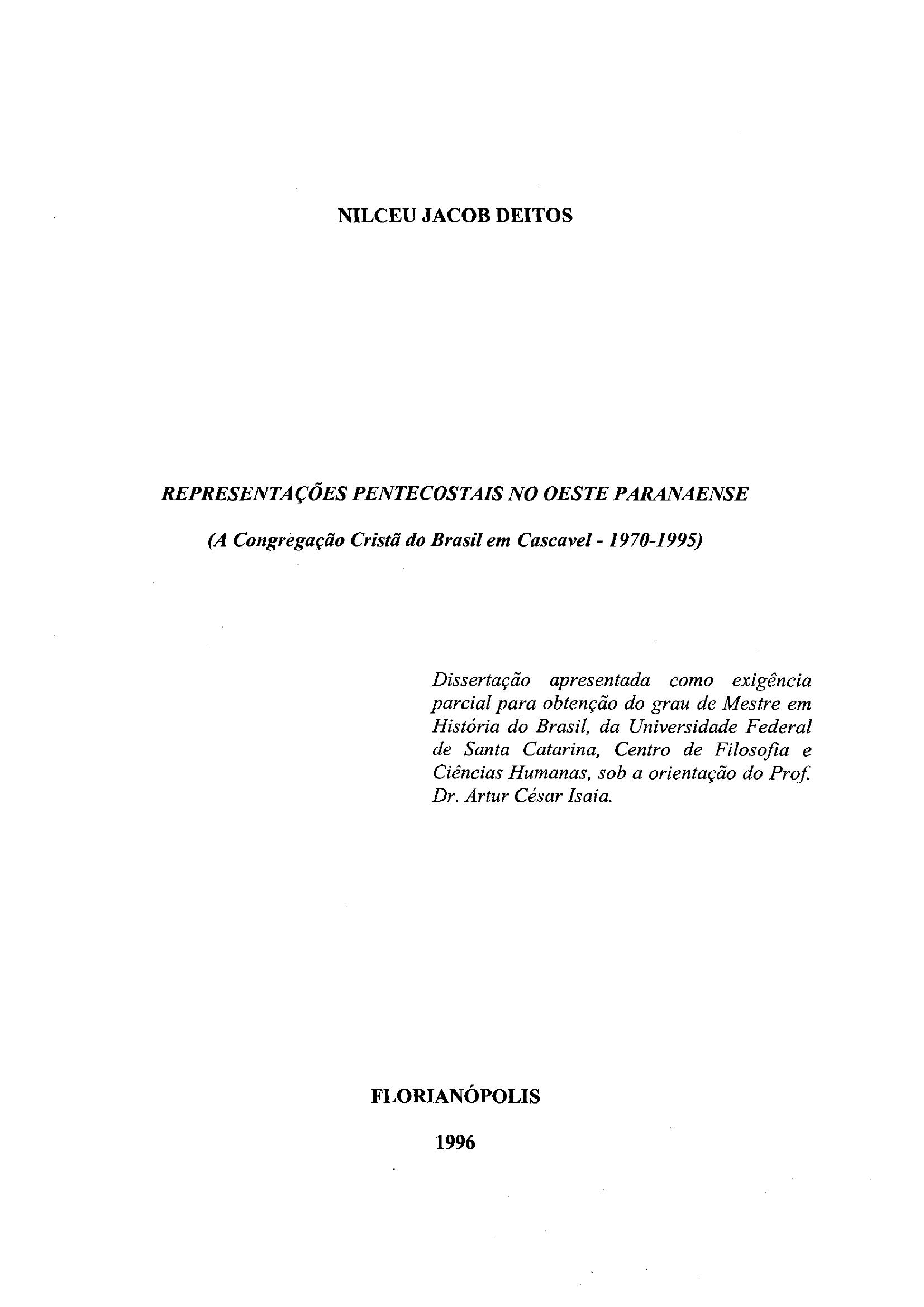A presente dissertação aborda as representações pentecostais no oeste paranaense, tendo como delimitação a Congregação Cristã do Brasil em Cascavel (1970-1985). No texto é investigado a construção das representações do "caos" e do "nomos" que são constantes nas manifestações religiosas. Antes de adentrar no imaginário pentecostal é considerado o período histórico da colonização do oeste do Paraná onde se registra a predominância católica e a presença do protestantismo. Neste período são analisados os grupos colonizadores e as ações pastorais desenvolvidas pela Igreja Católica, que passam a delimitar o seu campo religioso, atuando na nomização dos fiéis que ocupam a região oeste do Estado. O texto considera também o processo de tecnificação agrícola e urbanização daquela região, sendo que concomitante às mudanças sociais, também se registram mudanças religiosas, apontando para o aparecimento do pentecostalismo. Ao considerar algumas representações, o texto aponta para o perfil do novo homem que se constrói a partir dos discursos e práticas pentecostais. |
