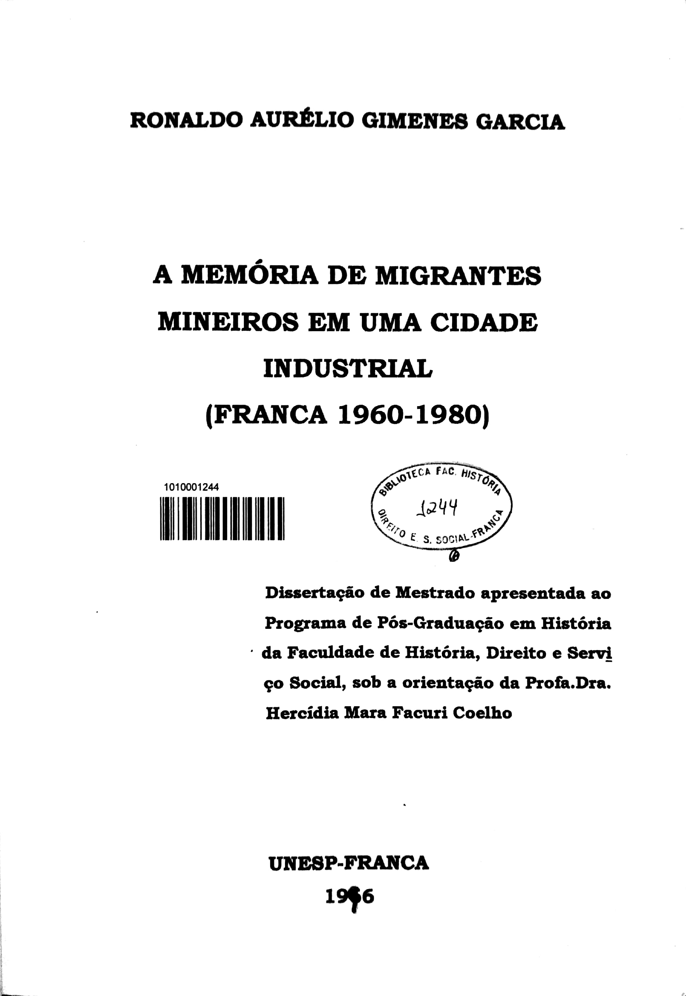 A Memória de Migrantes Mineiros em uma Cidade Industrial (Franca 1960-1980)