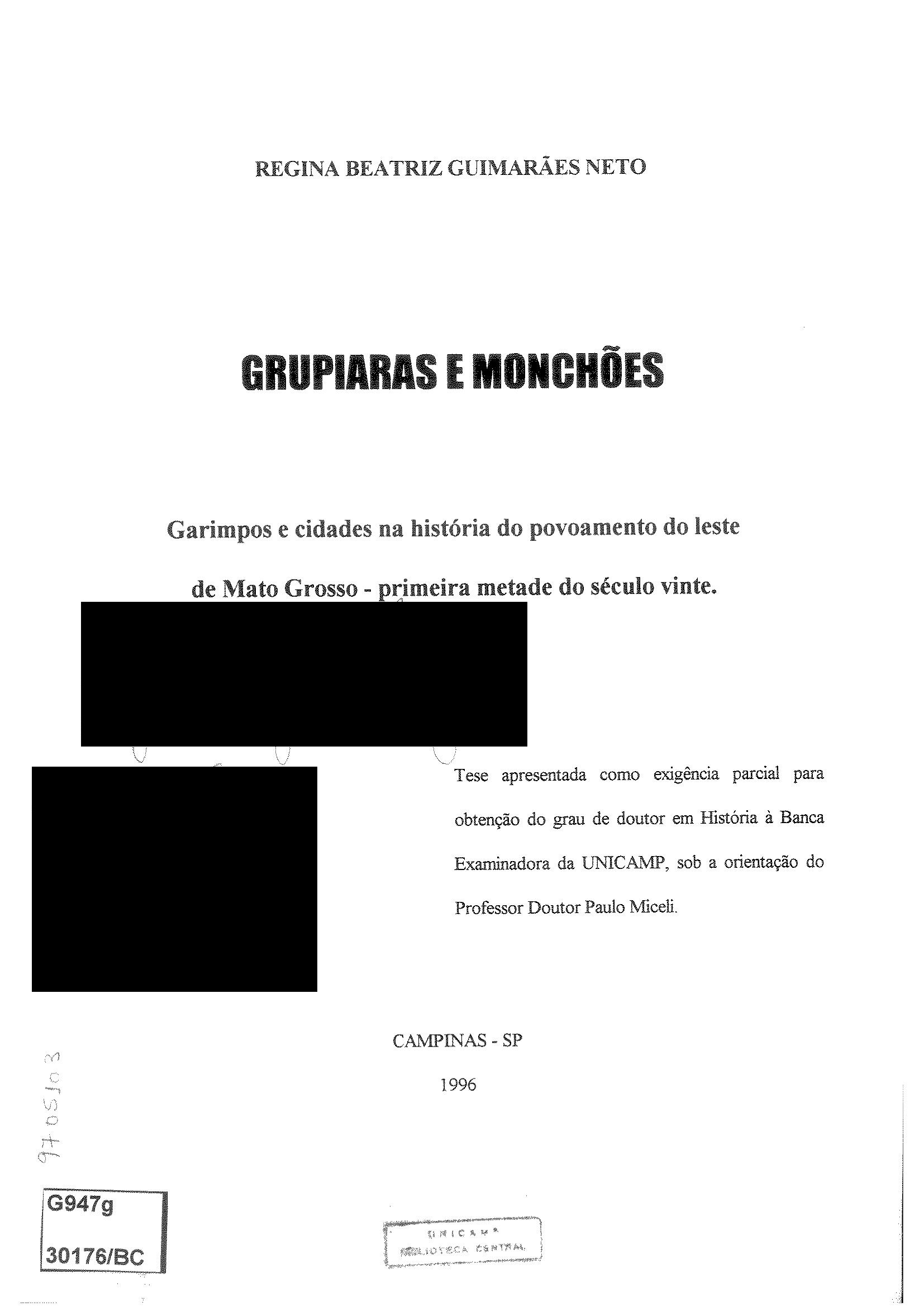 Grupiaras e Monchões: Garimpos e Cidades na História do Povoamento do Leste de Mato Grosso - Primeira Metade do Século Vinte