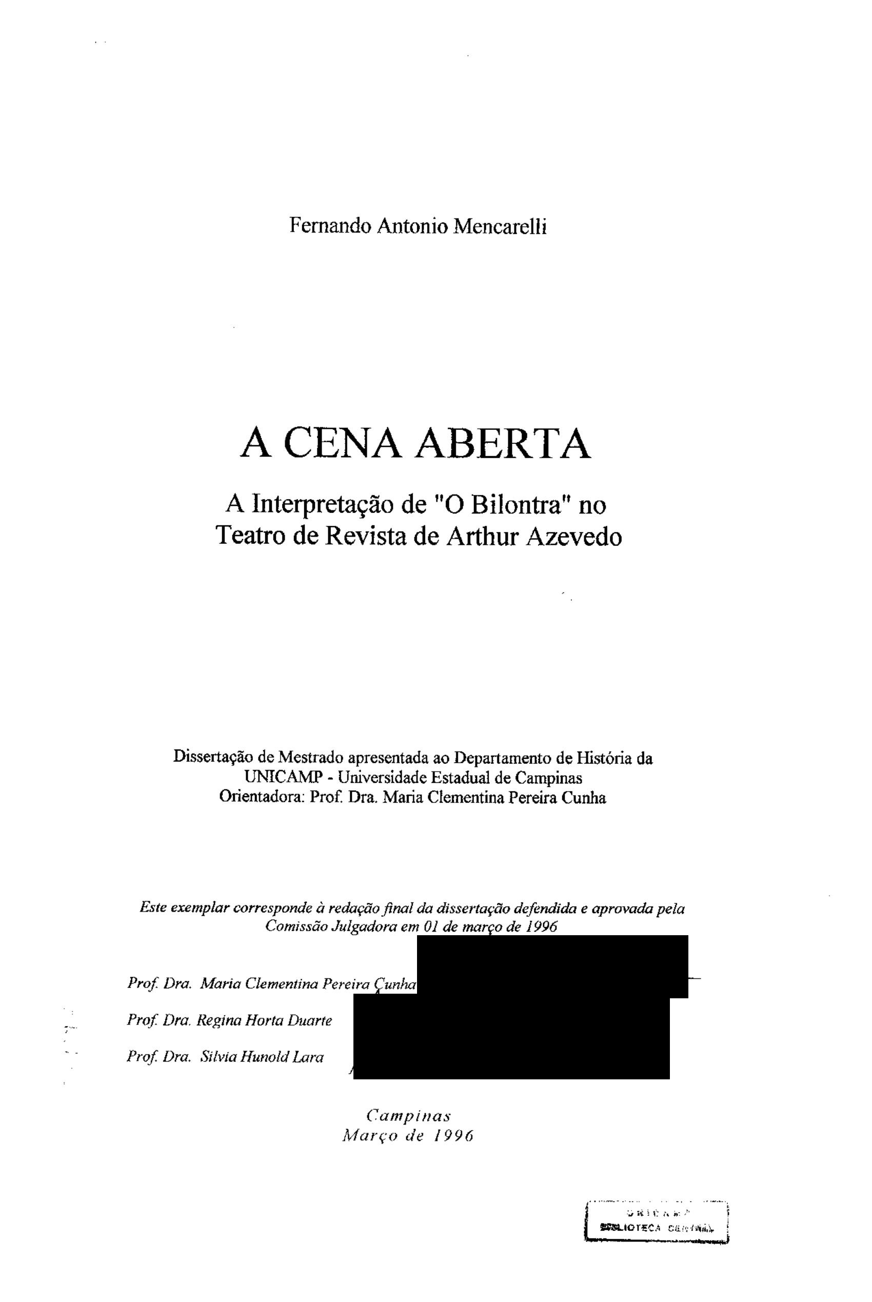 A Cena Aberta. A Interpretação de "O Bilontra" no Teatro de Revista de Arthur Azevedo