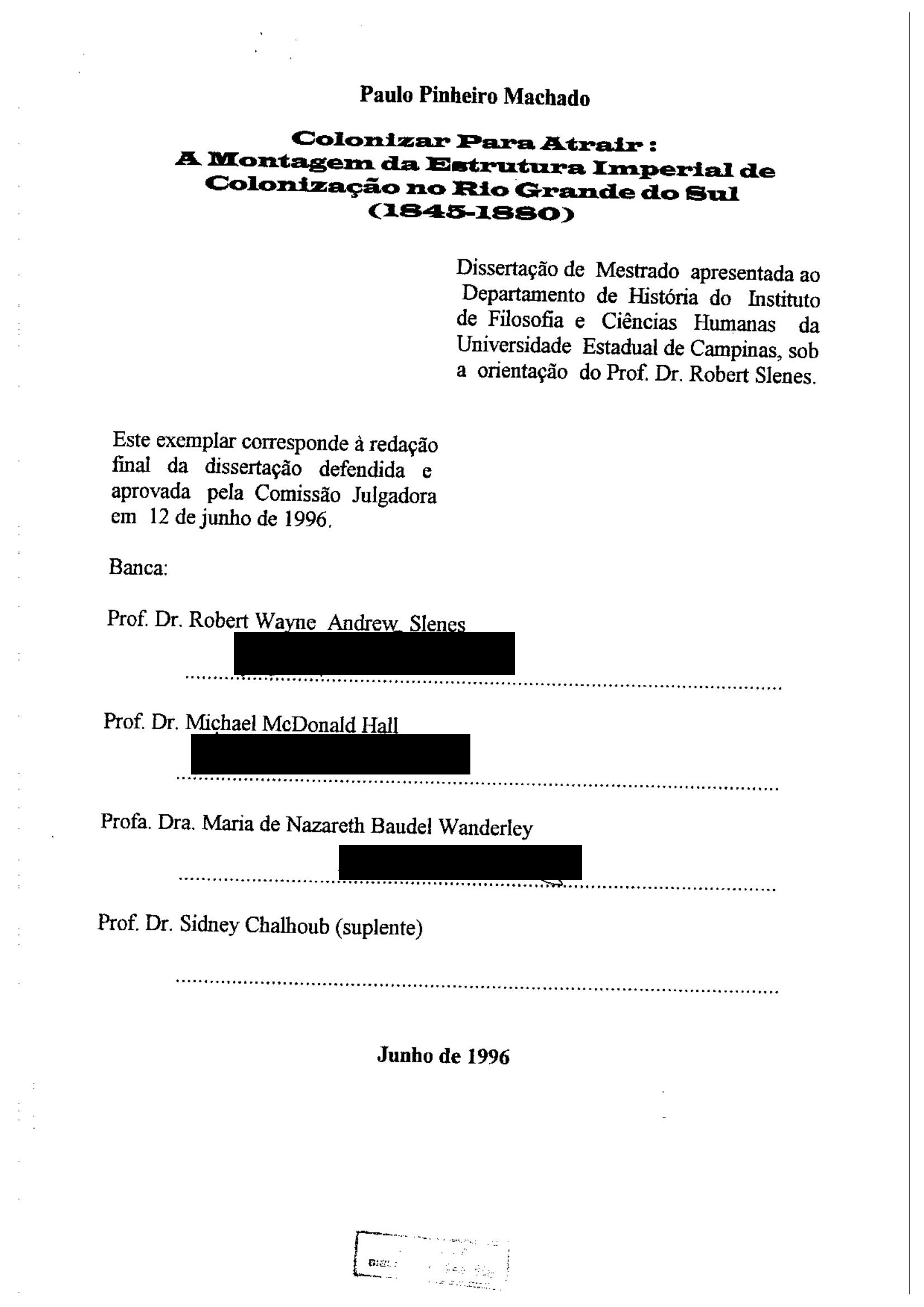 Paulo Pinheiro Machado (Orientador: Robert Wayne Andrew Slenes)