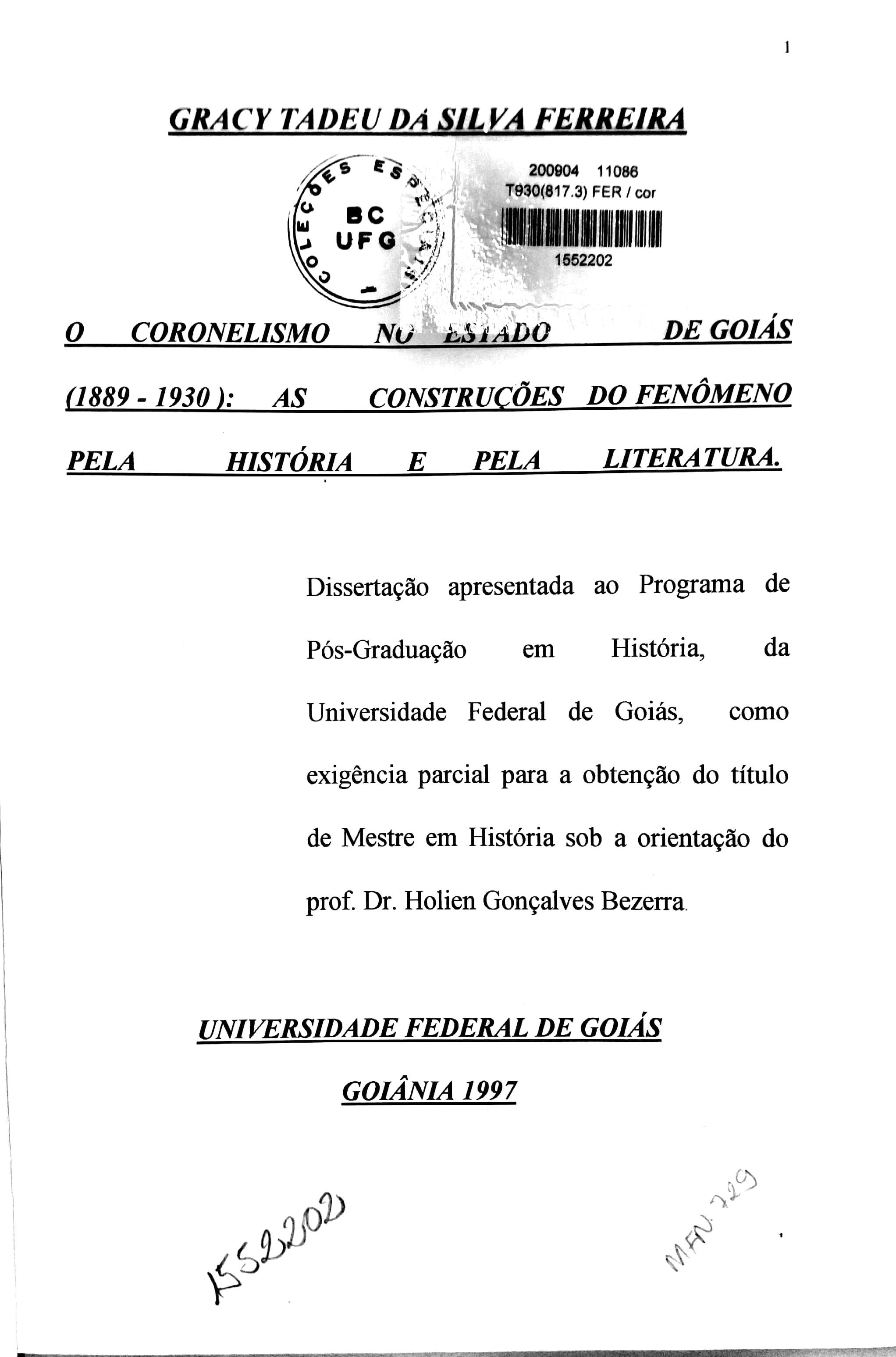 Este trabalho procurou, através da análise de obras e dissertações de mestrado sobre o coronelismo, mostrar como foi construído o conhecimento histórico e literário do fenômeno coronelístico em Goiás. O primeiro capítulo teve como objetivo de análise as "inter-relações existentes entre a História, a Literatura e a Cultura". O conhecimento histórico foi tratado como um campo de possibilidades, de diálogo com o imaginário, a mentalidade e a ideologia. O estudo nos levou a considerar o coronelismo fazendo parte de uma cultura com características peculiares, regionais, orientando, assim, o caminho da investigação. O segundo capítulo, "O coronelismo em questão: as descrições do fenômeno", toma como ponto de partida para a análise o início do regime republicano e sua estruturação político-econômica. Em seguida é apresentada a visão dos autores considerados clássicos: Leal, Queiroz, Faoro, Carone, Pang e Vilaça sobre o coronelismo. Estes autores são clássicos porque os conceitos, categorias - chaves e questões - norteadoras utilizados por eles para definir o coronelismo. O mesmo foi constatado em relação aos autores goianos. Neste capítulo, houve a preocupação de registrar como os autores goianos construíram as suas abordagens sobre o fenômeno coronelístico, que recursos foram usados, que preocupações foram retratadas. No terceiro capítulo, "O coronel e a clientela sob o prisma literário e cultural", buscou-se avaliar a construção feita do coronelismo pela Literatura, evidenciando quais os recursos empregados pelos autores na construção do fenômeno. Nas consideraçôes finais, buscou-se primordialmente cotejar as leituras feitas pela História e Literatura sobre o fenômeno coronelístico no Estado de Goiás. |