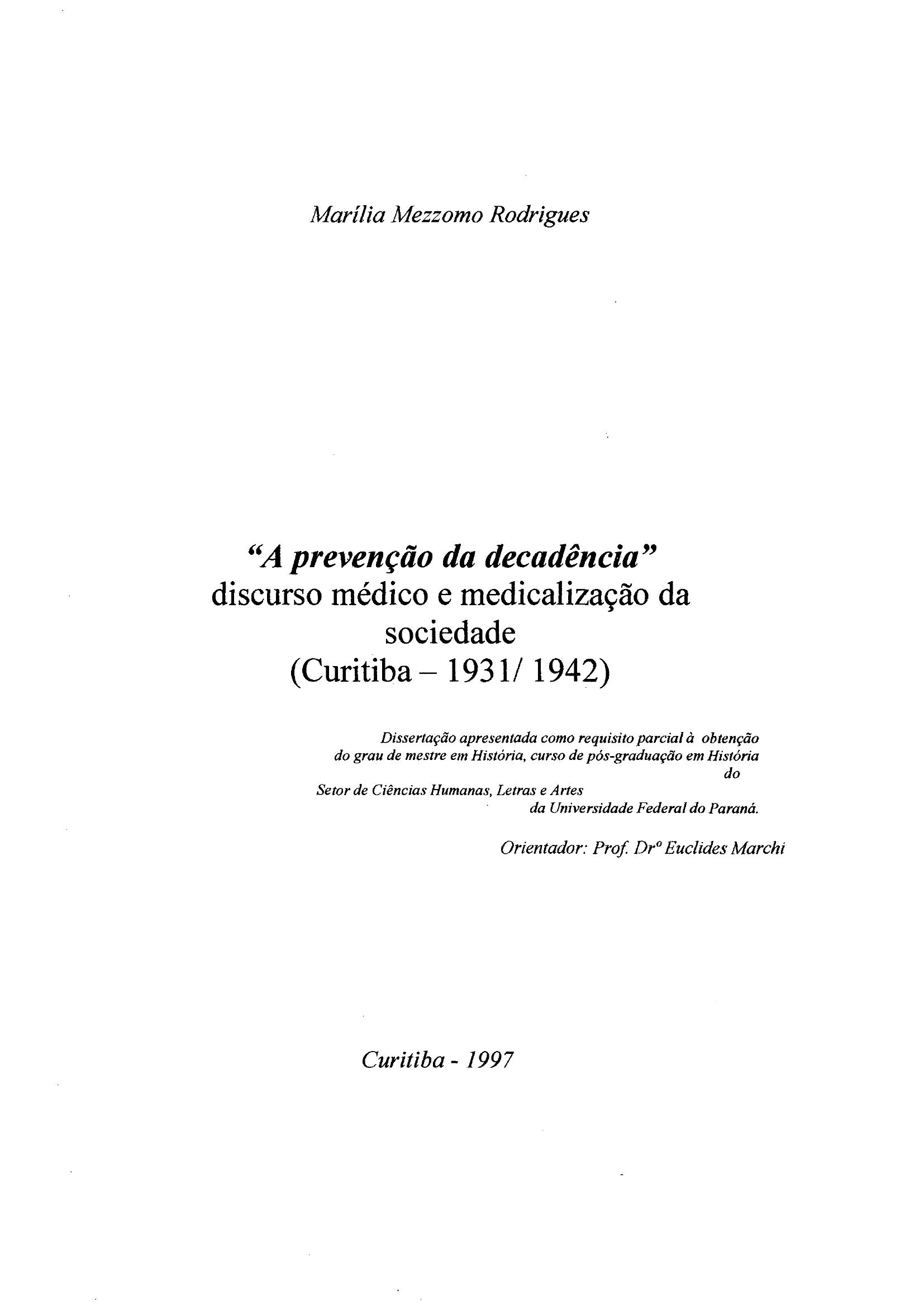 "A Prevenção da Decadência": Discurso Médico e Medicalização da Sociedade (Curitiba - 1931/1942)