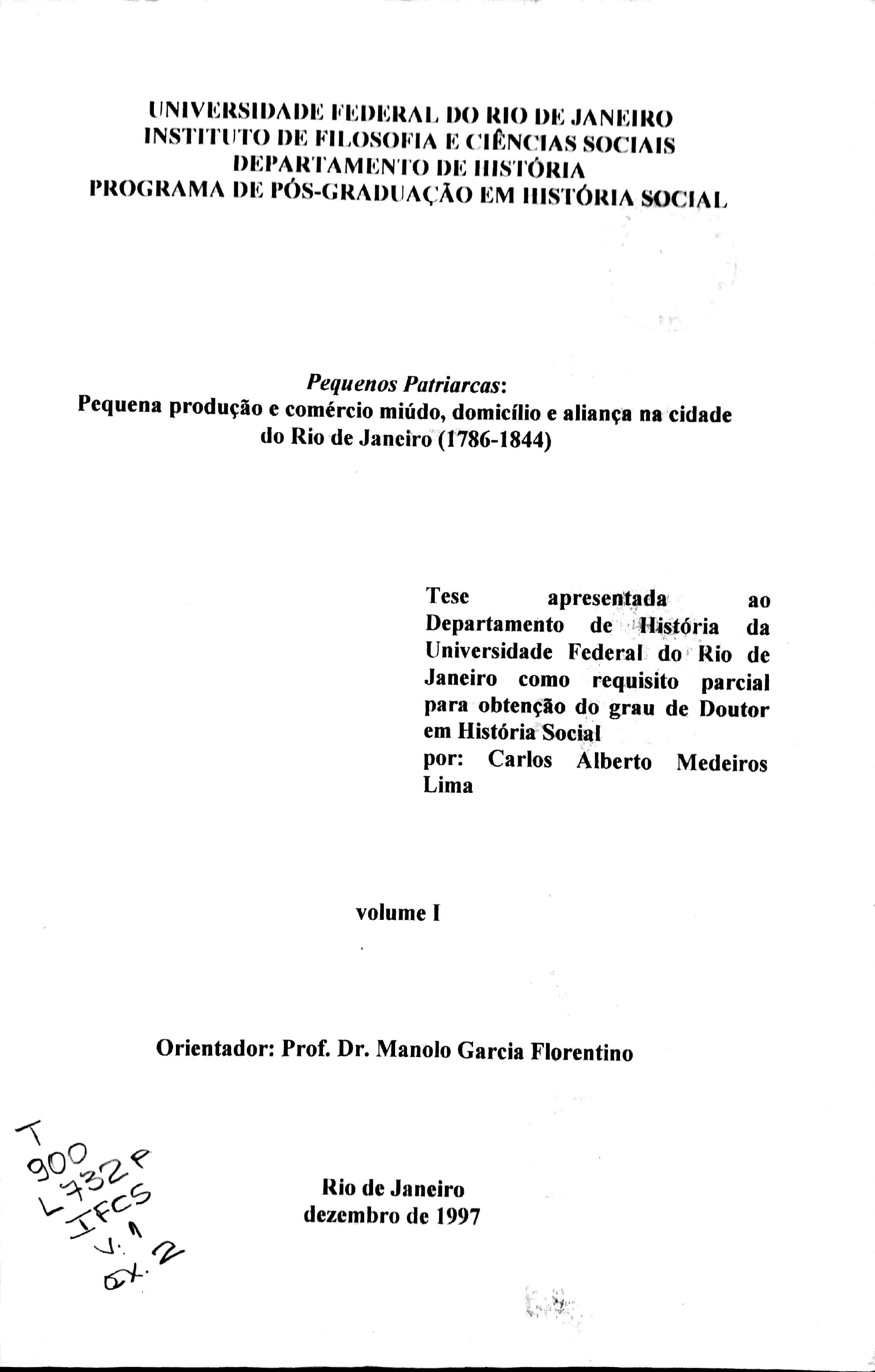 Pequenos Patriarcas: Pequena Produção e Comércio Miúdo, Domicílio e Aliança na Cidade do Rio de Janeiro (1786-1844)