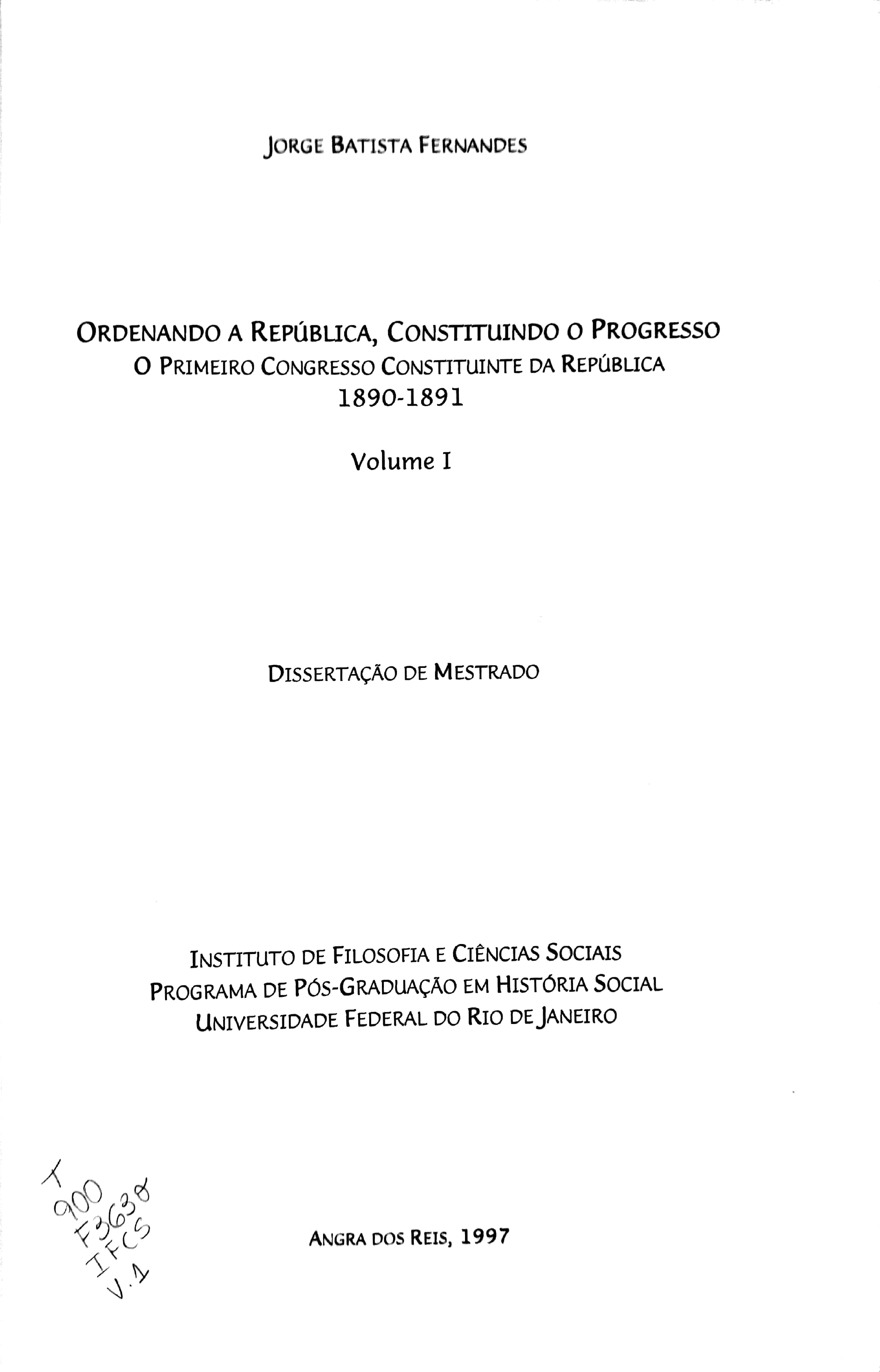 Ordenando a República, Constituindo o Progresso: O primeiro Congresso Constituinte da República 1890-1891