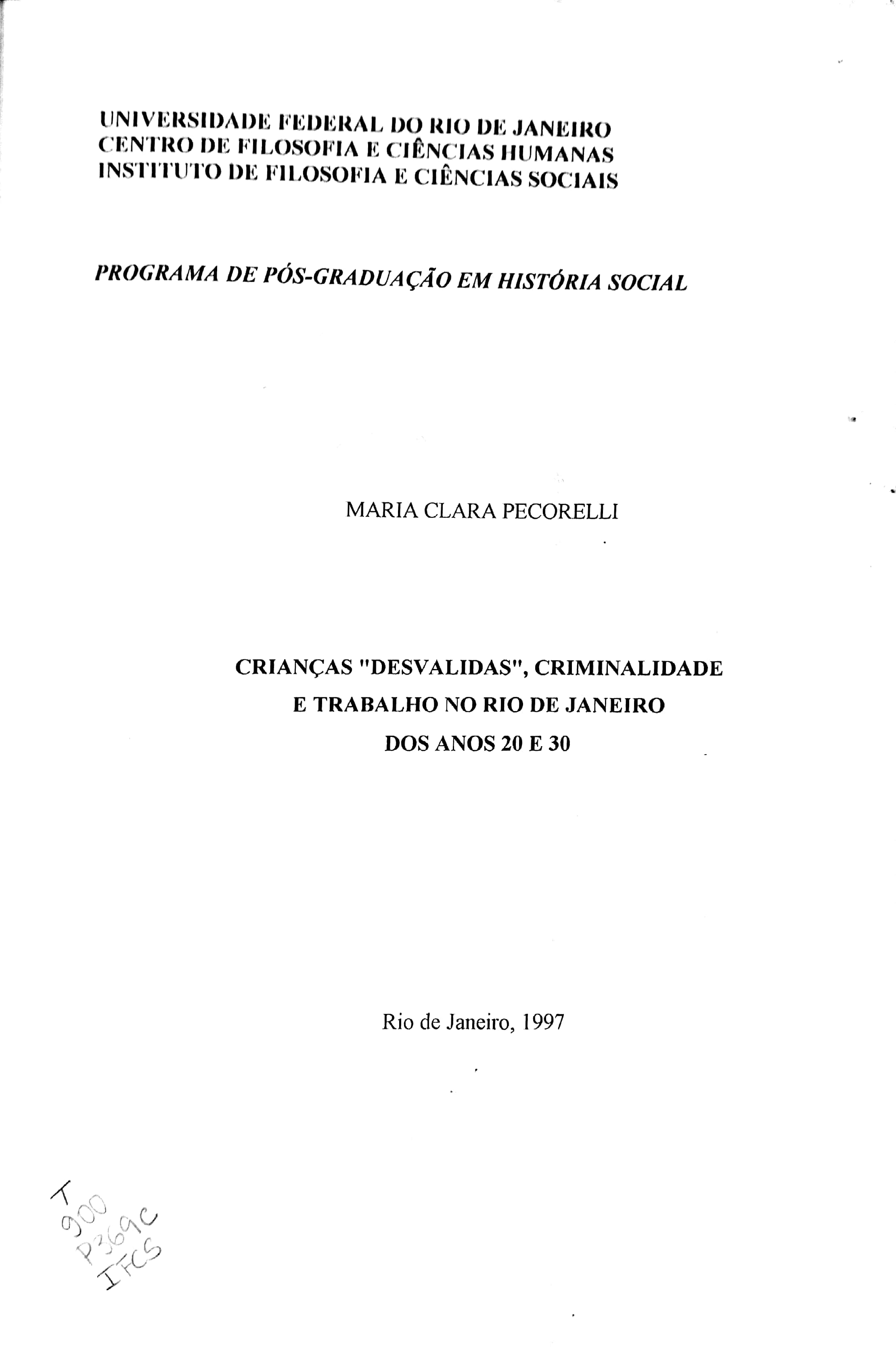 Crianças "Desvalidas", Criminalidade e Trabalho no Rio de Janeiro dos Anos 20 e 30