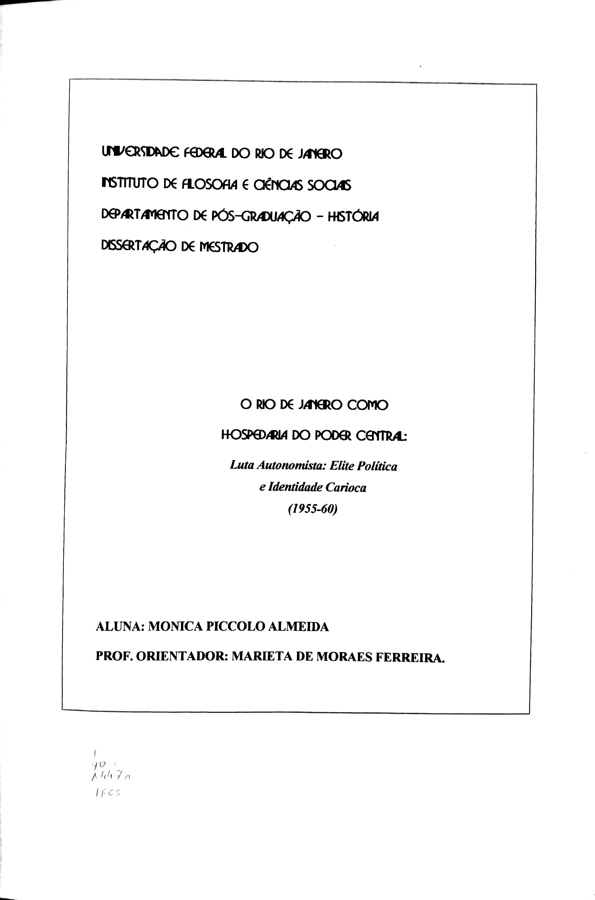 O Rio de Janeiro como Hospedaria Central: Luta Autonomista: Elite Política e Identidade Carioca (1955-60)