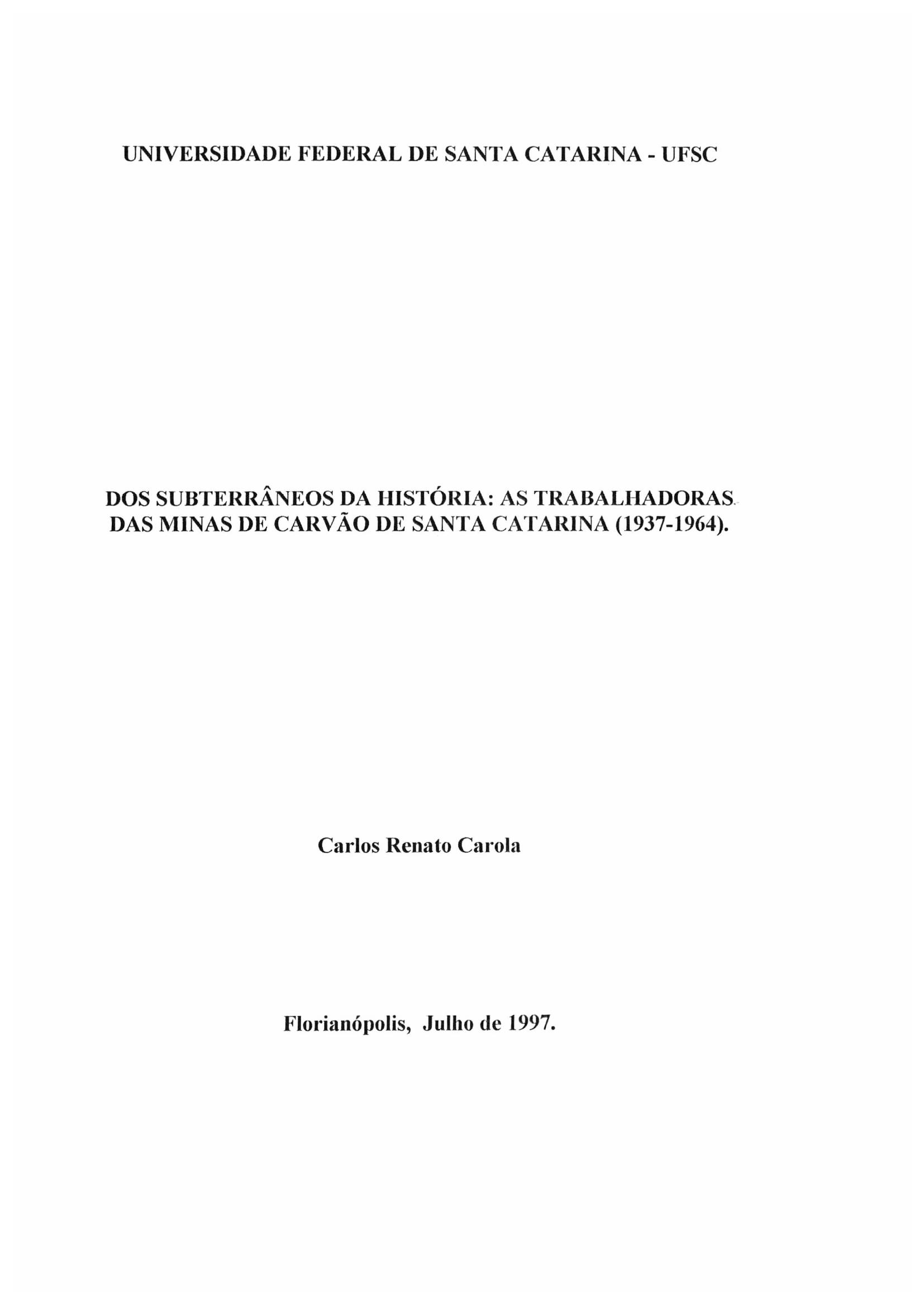 Dos Subterrâneos da História: As Trabalhadoras das Minas de Carvão de Santa Catarina (1937-1964))