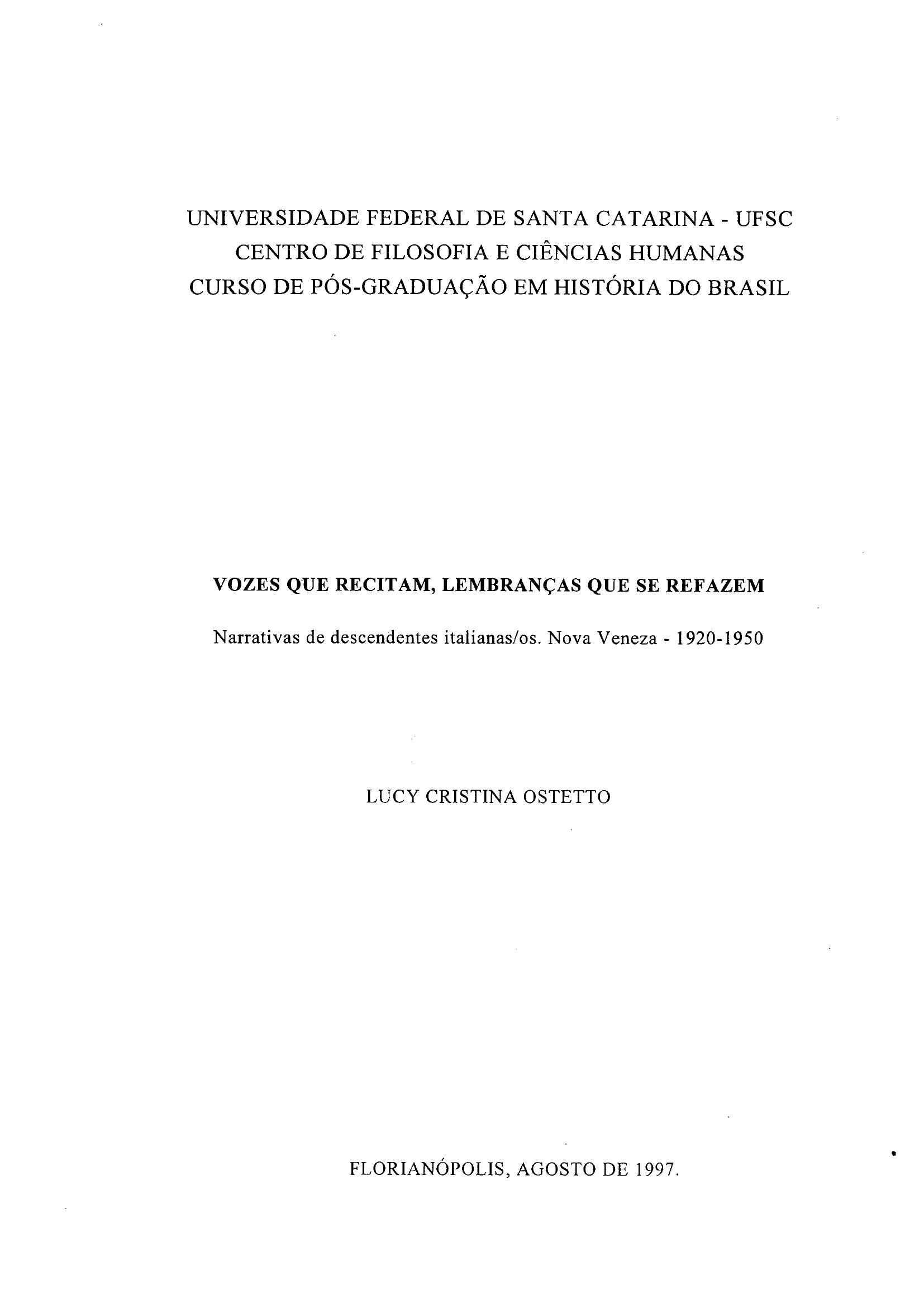 Vozes que Recitam, Lembranças que se Refazem: Narrativas de Descendentes Italianas/os. Nova Veneza - 1920-1950