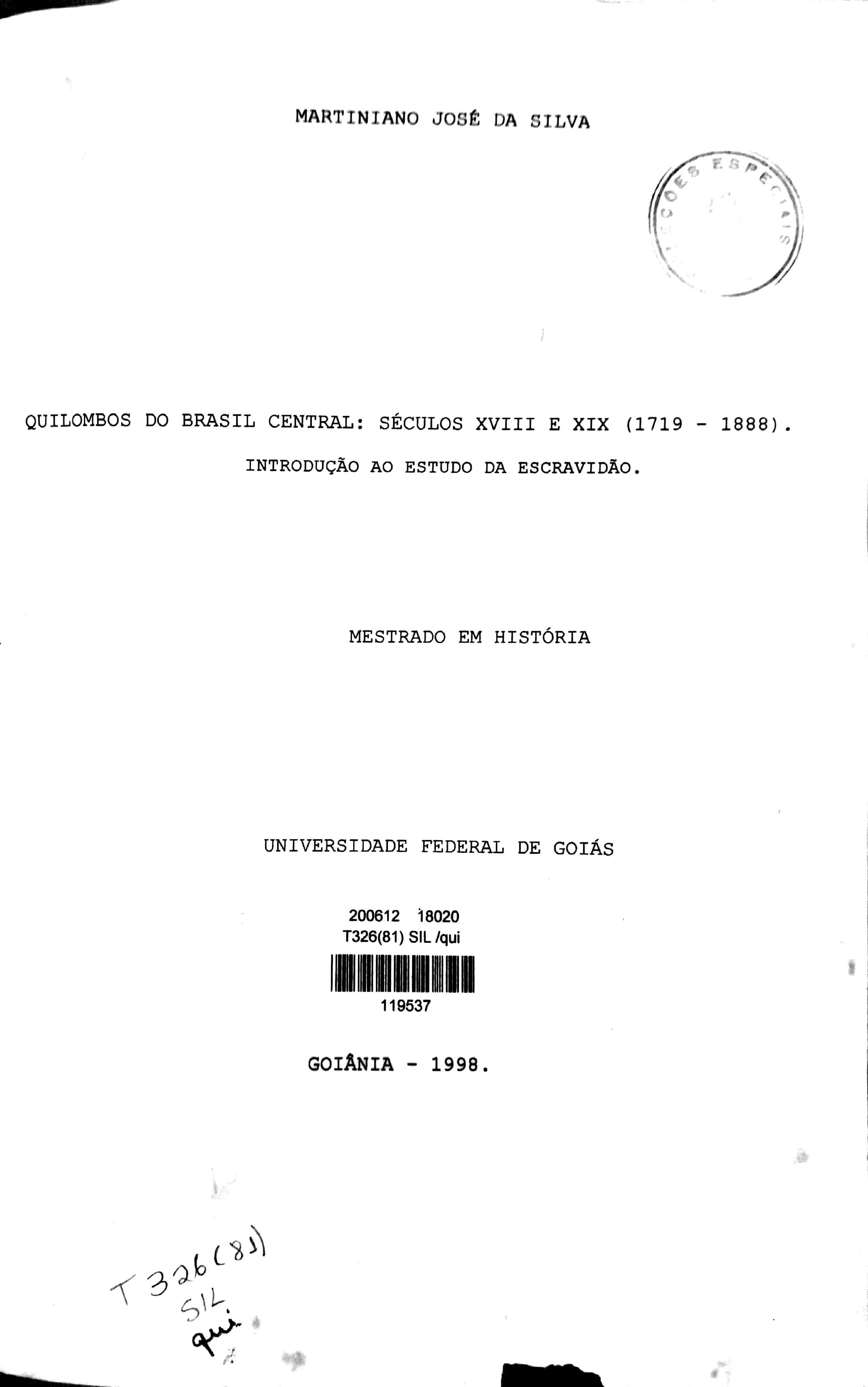 Em Quilombos do Brasil Central (1719-1888), procuramos contextualizar e descrever a chegada do escravismo colonial e seu longo processo de colonização e dominação de Mato Grosso e Goiás, tendo como contraponto a resistência dos escravos de origem africana. Fundado em ampla pesquisa, objetiva mostrar a resistência negra, especialmente na sua forma de rebeldia mais específica, ou "unidade básica", que foi o quilombo, onde o escravo é agente catalisador na desagregação e transformação social da ordem escravista, construindo e buscando valores como o da liberdade. Com esta visão, o quilombo busca a liberdade através de duas estratégias essenciais: a de conseguir escapar (fuga individual), e a de não ser recapturado, justificando o segundo "estágio", que é a luta coletiva pela liberdade étnica e política, formando quilombos, trazendo o terceiro "estágio" através da quilombagem onde já é livre e passa a agir coletivamente contra o sistema. Essa luta predominou em três regiões principais do Brasil Central: Vale do Guaporé, no oeste e norte de Mato Grosso, através do Quilombo do Piolho ou Quariterê; Sertão da Farinha Podre, sul da Capitania de Goiás, ora Triângulo Mineiro, sendo destaque o Quilombo do Ambrósio; e nordeste e norte goiano, sul e sudeste do atual Tocantins, através de quilombos do Vale do Paranã, figurando como o mais persistente e de maior duração em Goiás, o de Calunga. |