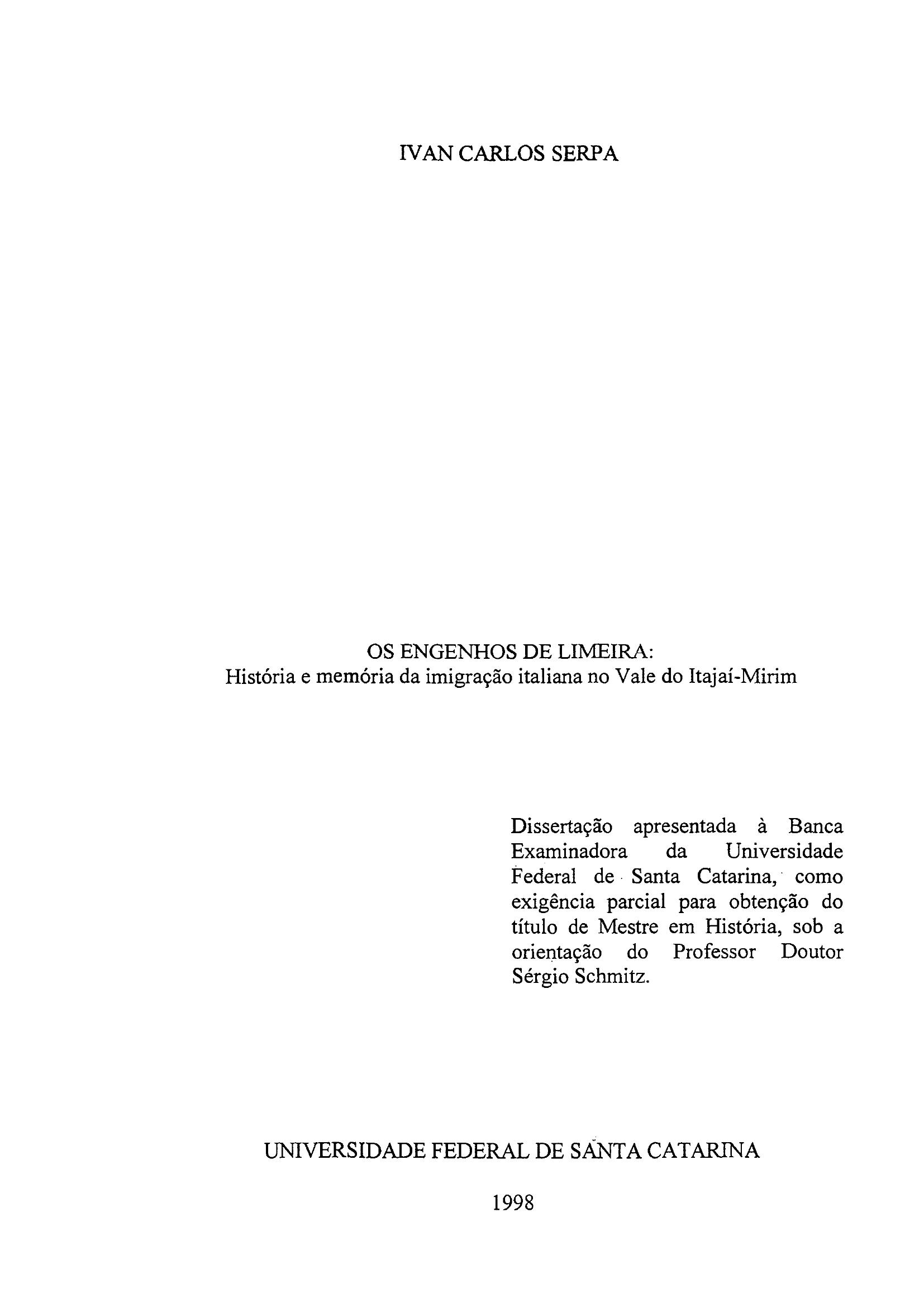 Esta dissertação enfoca a história de Limeira, comunidade de descendentes de imigrantes italianos constituída em 1875 na área da então Colônia Brusque, no Vale do Itajaí-Mirim, Santa Catarina, Brasil. Tendo como fonte histórica principal as memórias dos descendentes, busca-se reconstruir alguns aspectos da história local, desde sua formação, no final do século XIX, até os dias atuais. A temática central da investigação é a existência de antigos engenhos de farinha de mandioca movidos por rodas d'água, que em Limeira apresentam uma característica peculiar: além de serem meios de produção econômicos, constituem lugares de memória para a população local. Seu estudo revela interessantes aspectos da história local e da Região do Vale do Itajaí-Mirim. |