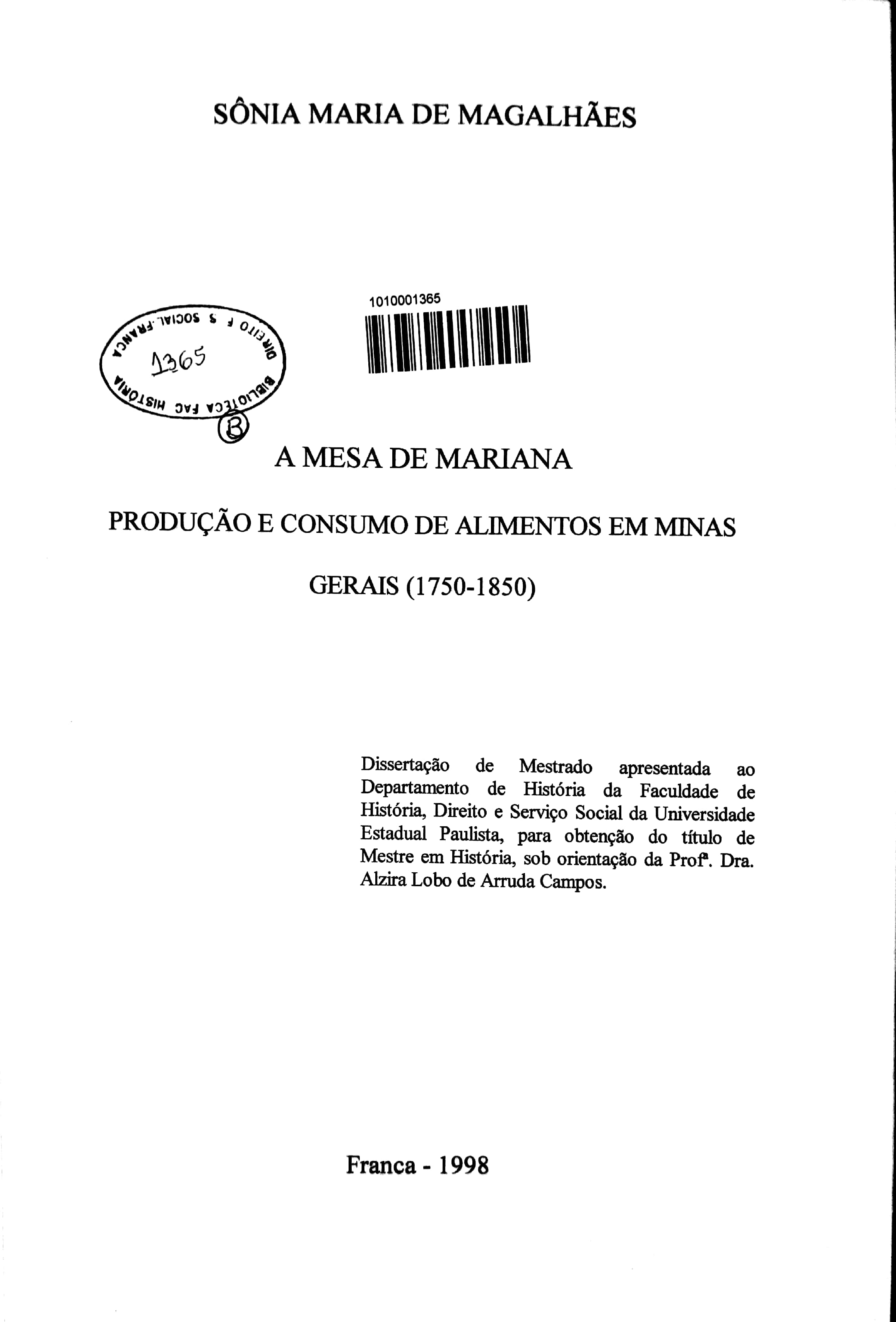 A Mesa de Mariana: Produção e Consumo de Alimentos em Minas Gerais (1750-1850)