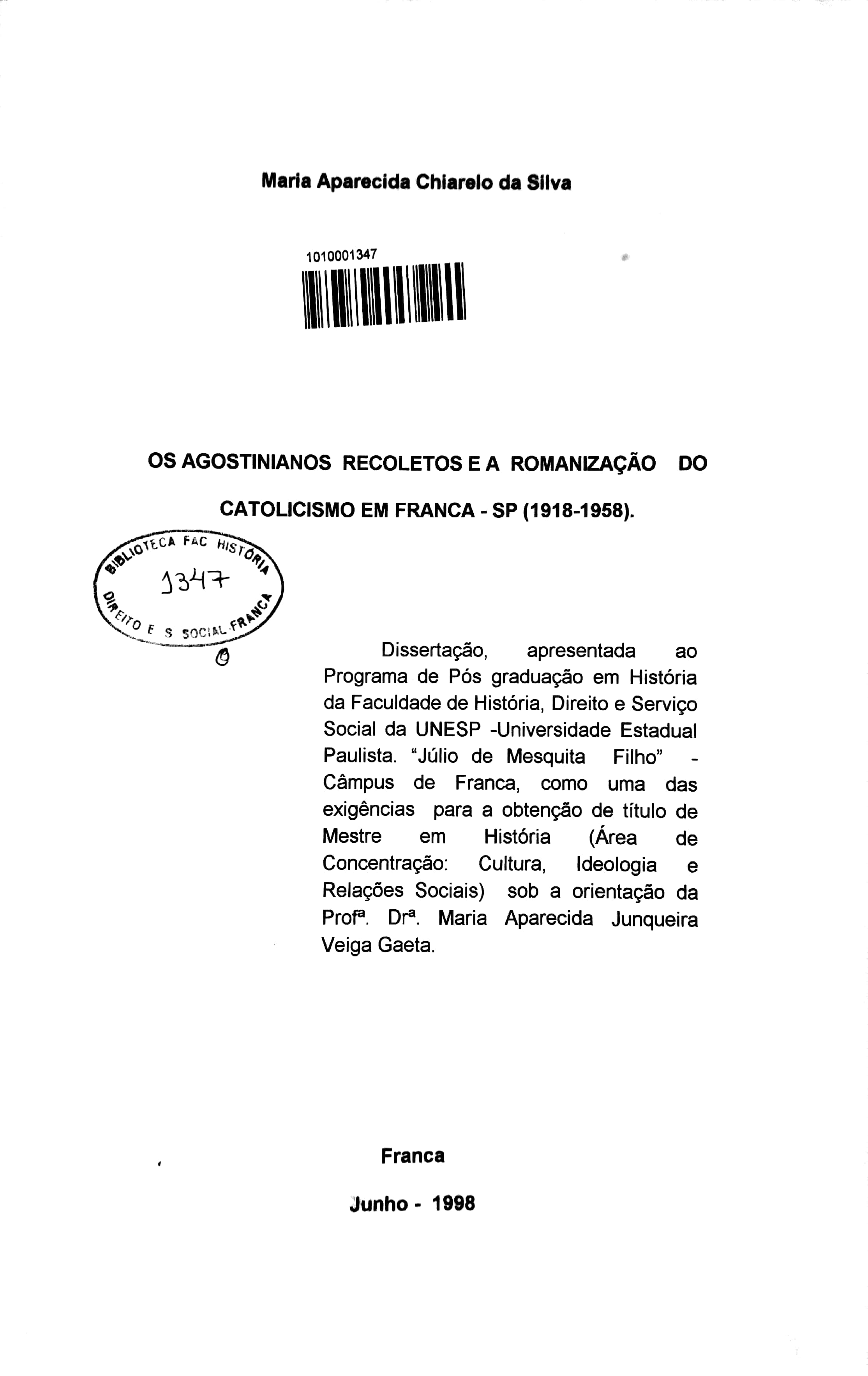Os Agostinianos Recoletos e a Romanização do Catolicismo em Franca - SP (1918-1958)