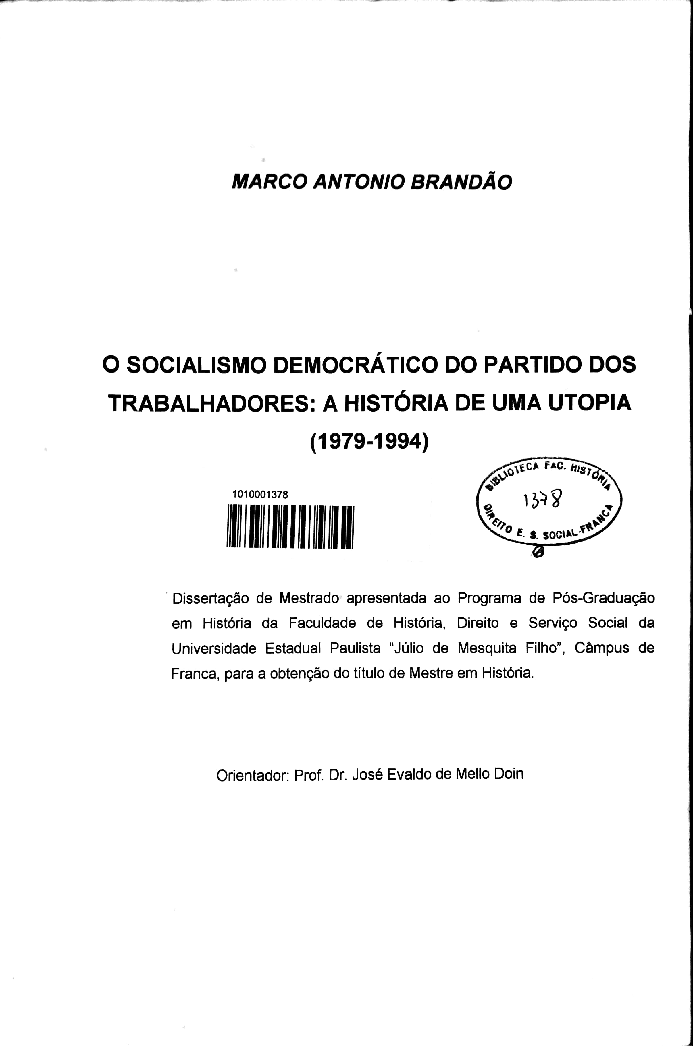 O Socialismo Democrático do Partido dos Trabalhadores: A História de uma Utopia (1979-1994)