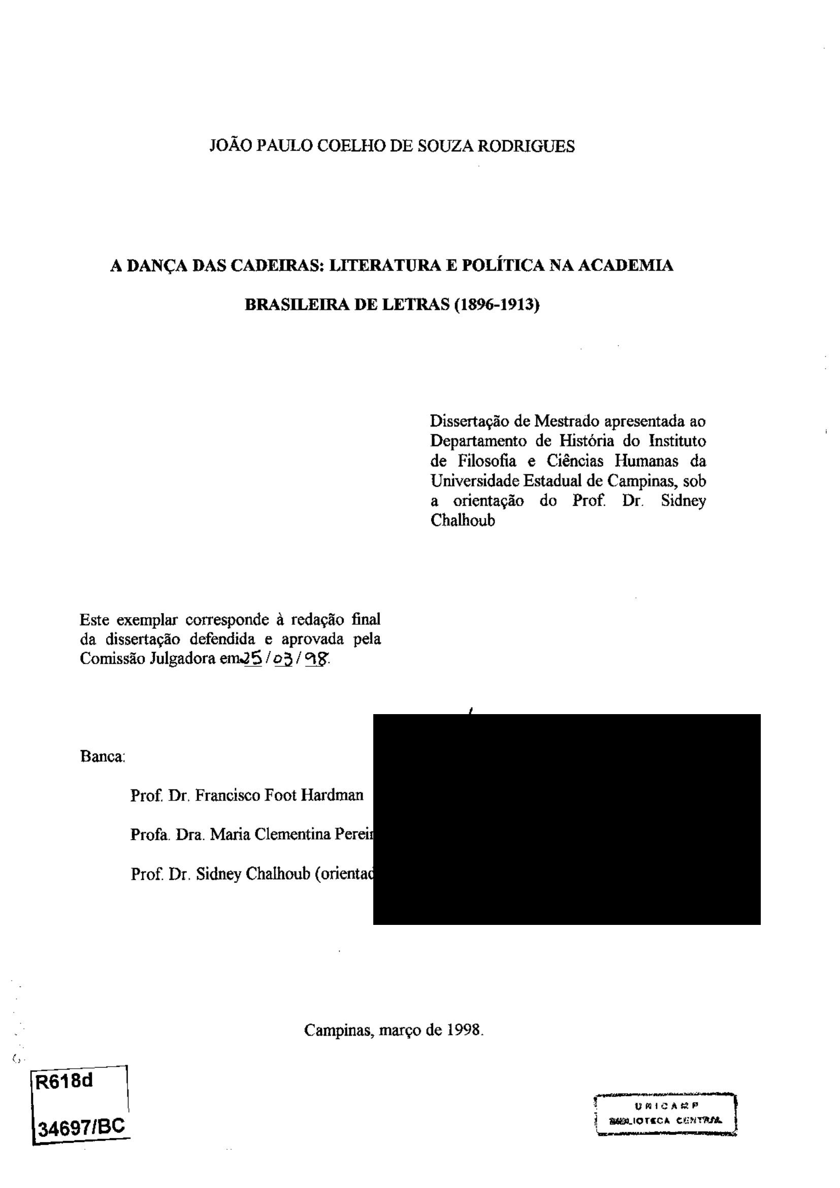 A Dança das Cadeiras: Literatura e Política na Academia Brasileira de Letras (1896-1913)