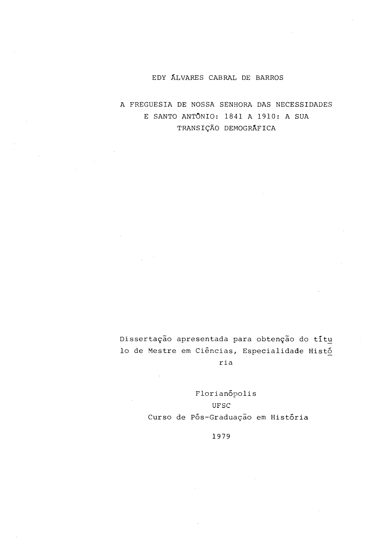 Empregando técnicas disponíveis em demografia histórica, que permitem a composição das Fichas de Família, a autora estudou, no período de 1841 a 1910, a população da freguesia de Nossa Senhora das Necessidades e Santo Antônio, localizada na Ilha de Santa Catarina. A hipótese que norteia o presente trabalho é a de que esta população, na época em questão, evoluiu de tradicional para uma etapa de transição demográfica, em direção a uma sociedade moderna (malthusiana). A verificação da hipótese é feita através de indicadores de mortalidade (expectativa de vida ao nascer, coeficientes de mortalidade geral e infantil, entre outros), da influência da Igreja na sazonalidade dos casamentos e concepções e de outros fatores demográficos, tais como a idade da mulher ao casar, natalidade, tamanho médio da família e o intervalo entre os filhos. Os indicadores foram gerados com base nos documentos sobre população e registros paroquiais de batizados, casamentos e óbitos. Esboçados os critérios para avaliar a evolução das variáveis, foram realizados testes paramétricos e não paramétricos, conforme o caso, sempre com nível de significância de 5%. Discutidas, superadas ou controladas as restrições ou dificuldades surgidas, admite-se que a nítida evolução da mortalidade, a sugestiva diminuição da influência da Igreja na sazonalidade dos casamentos e a nítida modificação nos fatores demográficos convergiram para a aceitação de que houve um movimento de transição demográfica para uma população malthusiana, tendo-se assim verificado a hipótese da pesquisa. |