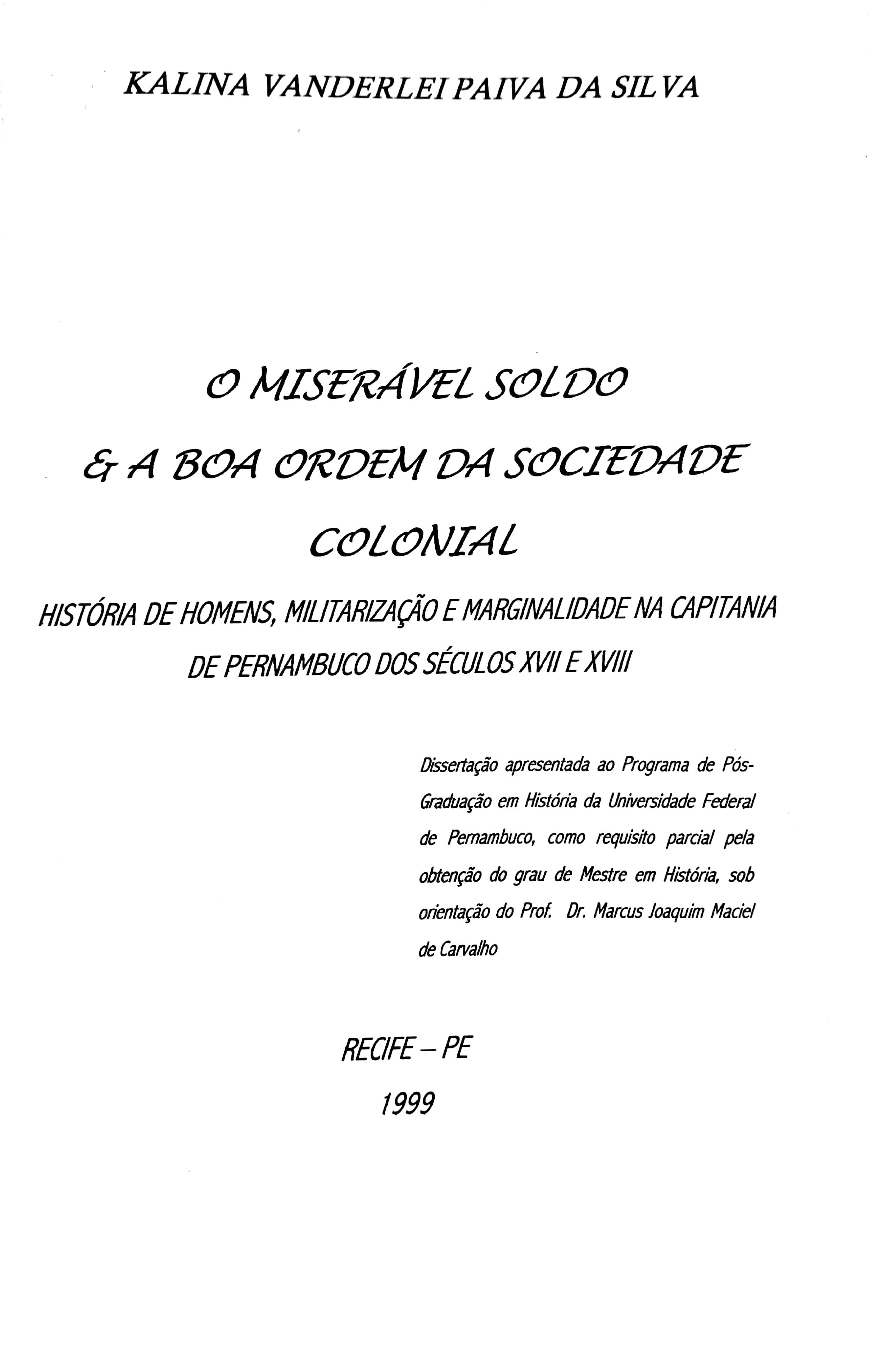 O Miserável Soldo & a Boa Ordem da Sociedade Colonial: História de Homens, Militarização e Marginalidade na Capitania de Pernambuco dos Séculos XVII e XVIII