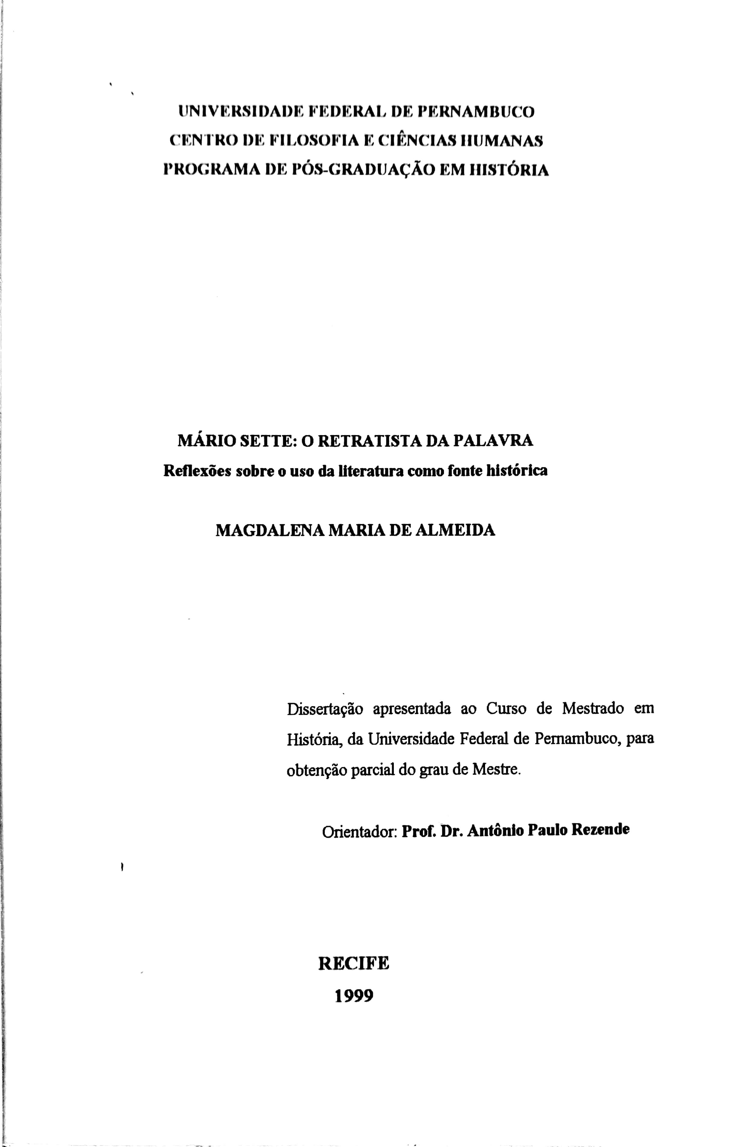 Mário Sette: O Retratista da Palavra. Reflexões sobre o Uso da Literatura como Fonte Histórica