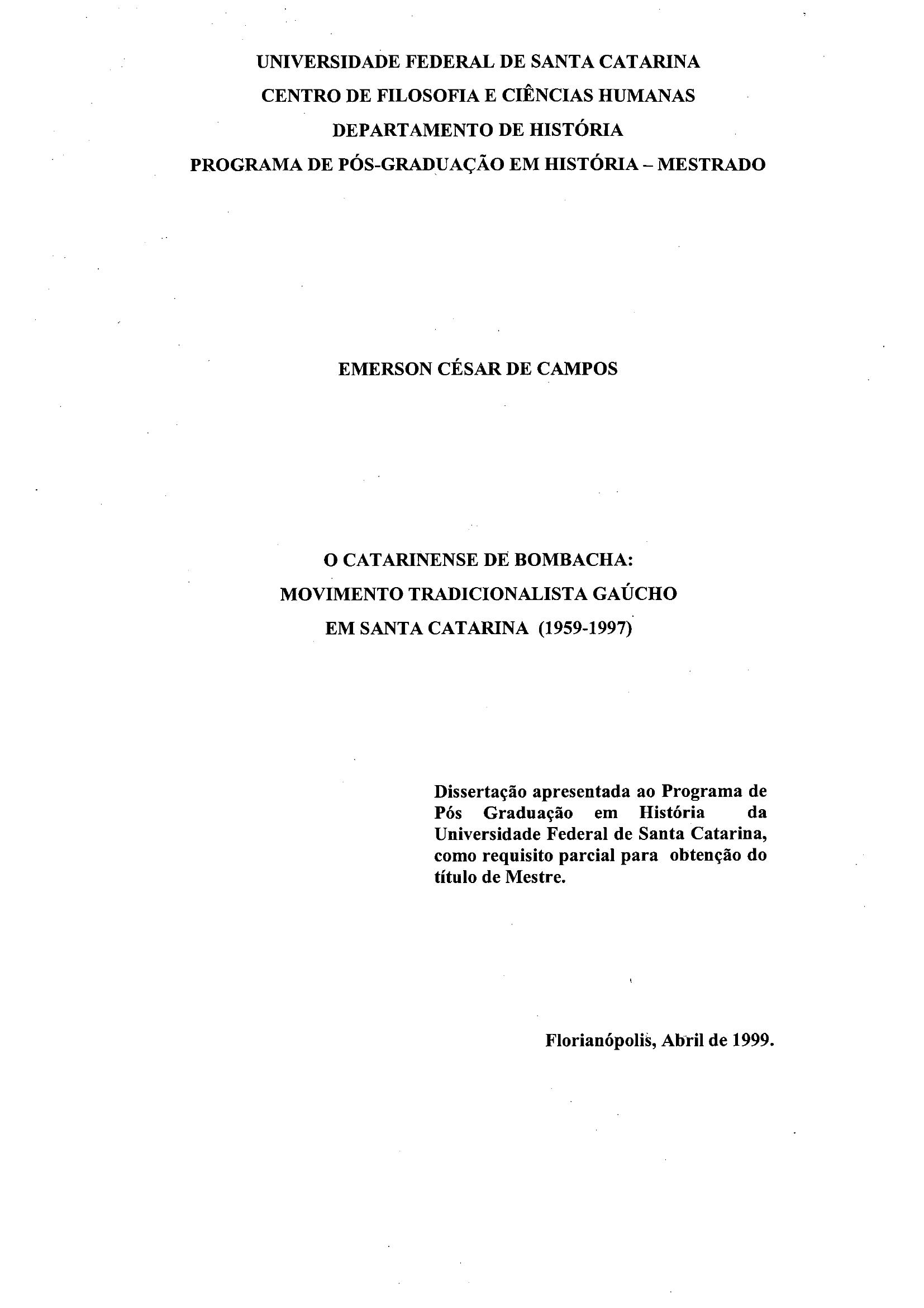 Neste trabalho se encontra a abordagem de um fenômeno sócio-cultural que vem ocorrendo em Santa Catarina nas últimas quatro décadas deste século: o Movimento Tradicionalista Gaúcho. Dentro da perspectiva da História Cultural, e explorando sua abrangência e possibilidades, este estudo se preocupa em mostrar as dimensões sociais, culturais e políticas, promovidas pelo tradicionalismo gaúcho no estado. Sendo assim, busca interpretar este Movimento através da análise do crescimento do número de Centros de Tradição Gaúcha em Santa Catarina (CTG's), responsáveis diretos pela expansão do tradicionalismo gaúcho, entre os anos de 1959 e 1997, relacionando-os à diversidade cultural do estado, bem como às tensões sociais que nela se fazem presente. Desta forma, resultam 3 capítulos relacionais: um primeiro que discute o gaúcho enquanto emergência sócio-cultural, partindo do Rio Grande do Sul e se estendendo até Santa Catarina; um segundo que mostra a expansão do Movimento Tradicionalista Gaúcho no estado, e por último, um terceiro capítulo que trata das práticas e representações empreendidas por este Movimento em sua expansão em Santa Catarina. |