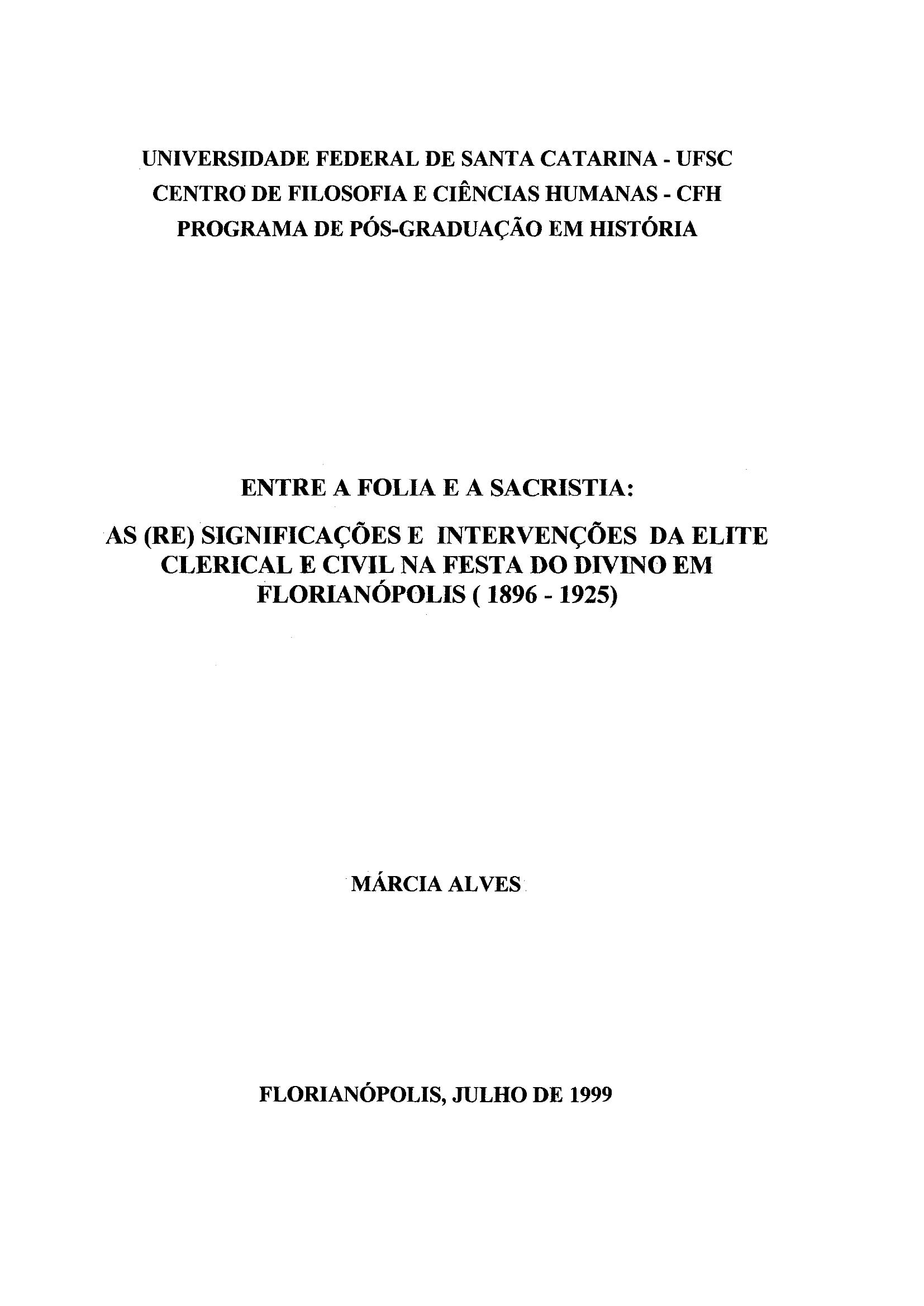 Festa do Divino em Florianópolis, sempre foi considerada uma importante expressão cultural, no calendário festivo da cidade. Durante o período estudado na pesquisa (1896-1925), a festa passa por uma remodelação. Este momento foi orientado nos moldes da romanização que os bispos católicos tentavam implantar no Estado. Eles visavam torná-la "civilizada" para os padrões daquela nova racionalidade. As elites civis estaduais apoiaram as novas orientações e ao mesmo tempo tentaram acatá-las, passando a condenar as atitudes tidas como "imorais" da população. Os conflitos, as normas e resistências, pesquisados neste trabalho, fazem parte deste momento da festa. |