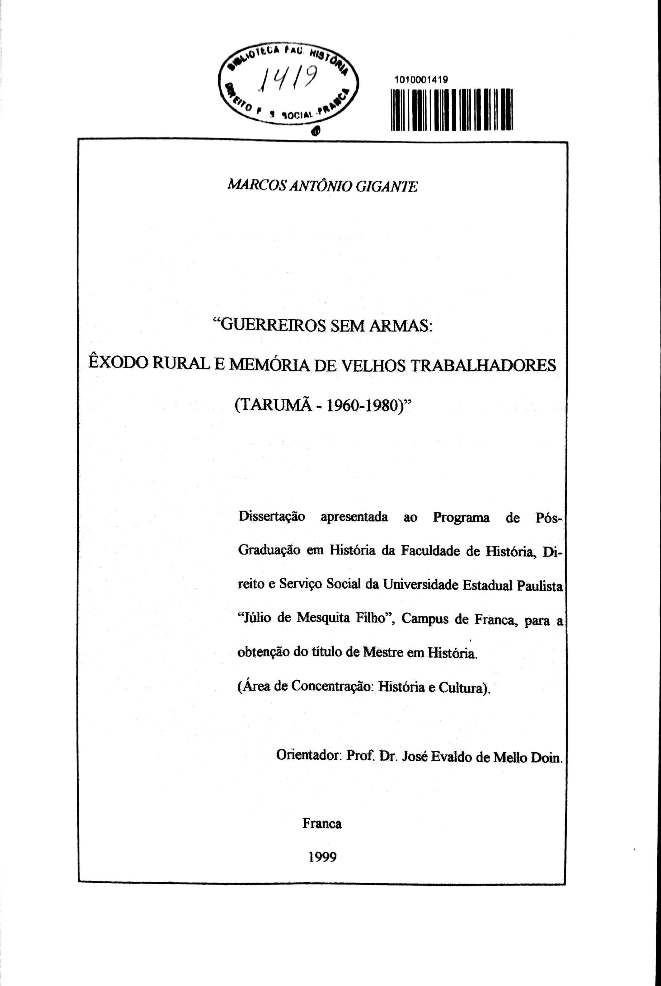 Guerreiros Sem Armas: Êxodo Rural e Memória de Velhos Trabalhadores (Tarumã - 1960-1980)
