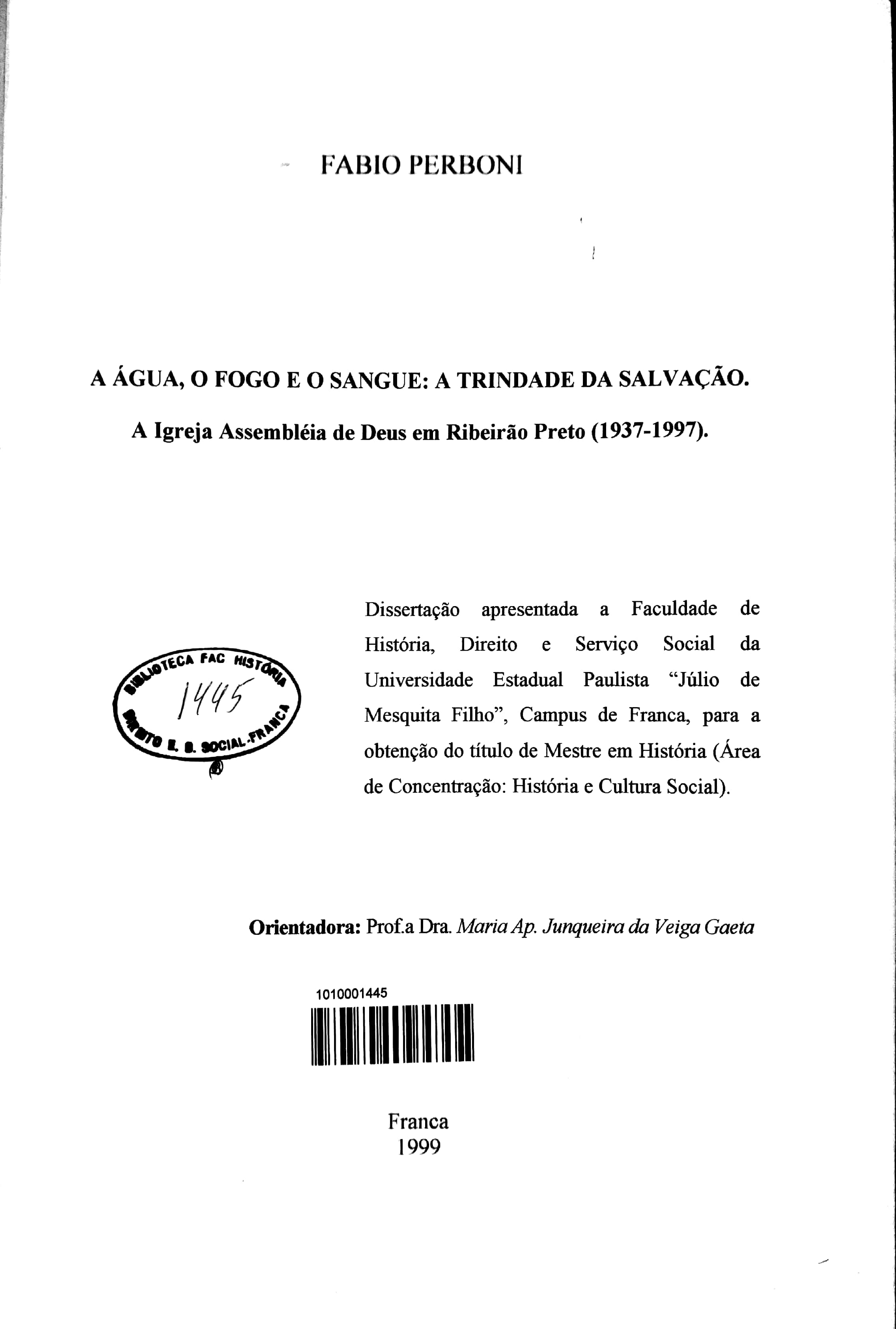 A Água, o Fogo e o Sangue: A Trindade da Salvação. Igreja Assembléia de Deus em Ribeirão Preto (1937-1997)