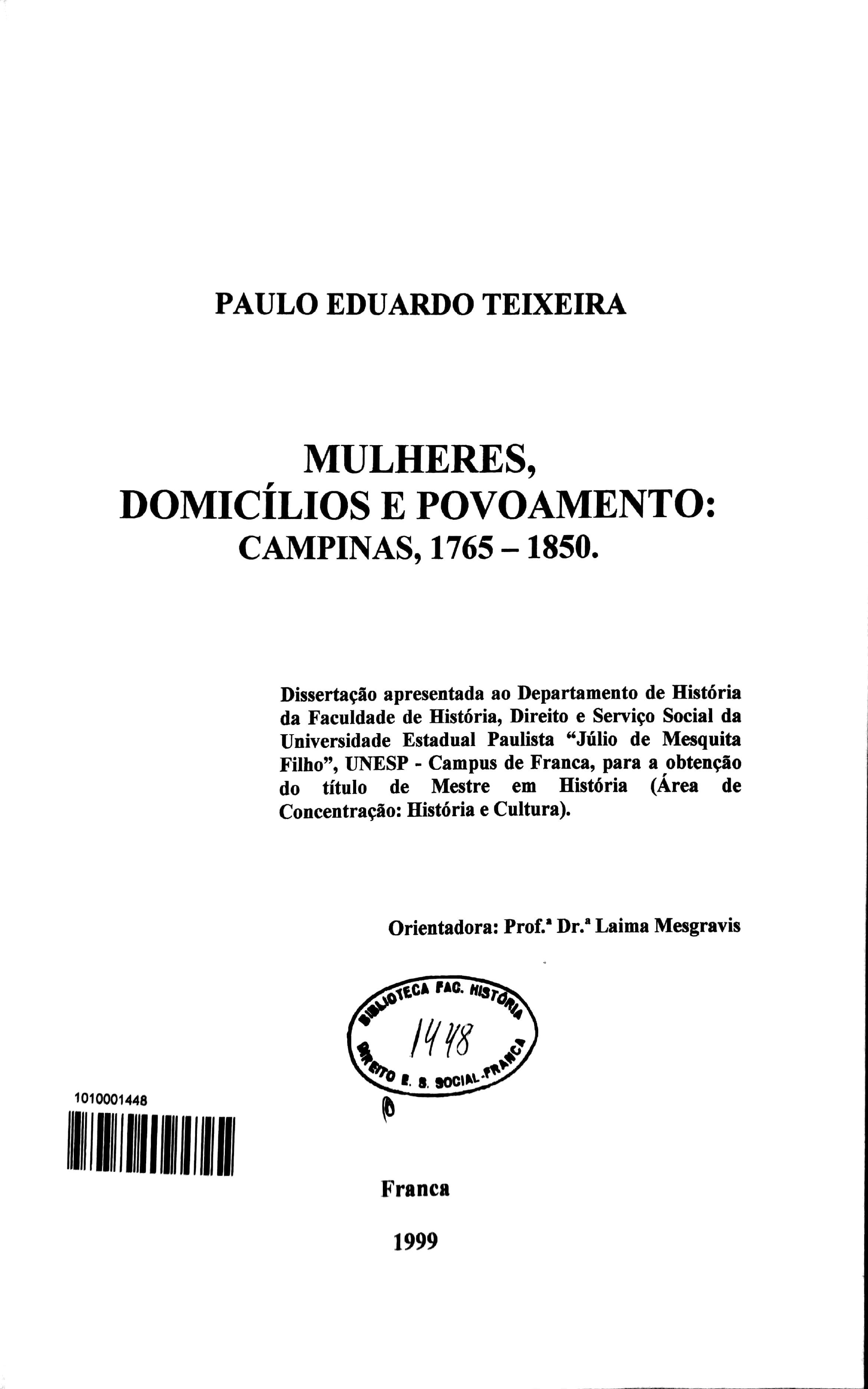 Mulheres, Domicílios e Povoamento: Campinas, 1765-1850