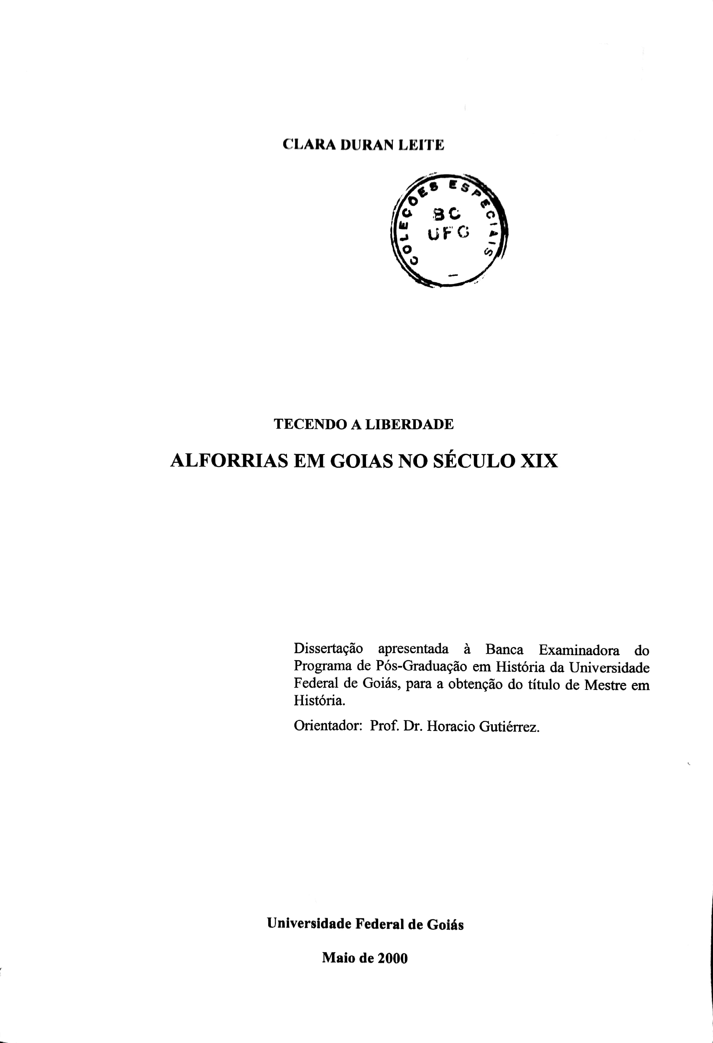 Tecendo a liberdade: alforrias em Goiás no século XIX, Têm como objetivo principal analisar os padrões de alforrias vigente na Província de Goiás do século XIX, assim como analisar as legislações existente sobre alforrias e as concessões das mesmas. Ao garimparmos os arquivos cartoriais das cidades goianas, buscando evidências para a nossa pesquisa, encontramos ação de liberdade, testamentos, ofícios, mapas de população escrava, que nos permitiram reconstituir parte da história da escravidão no estado de Goiás. |