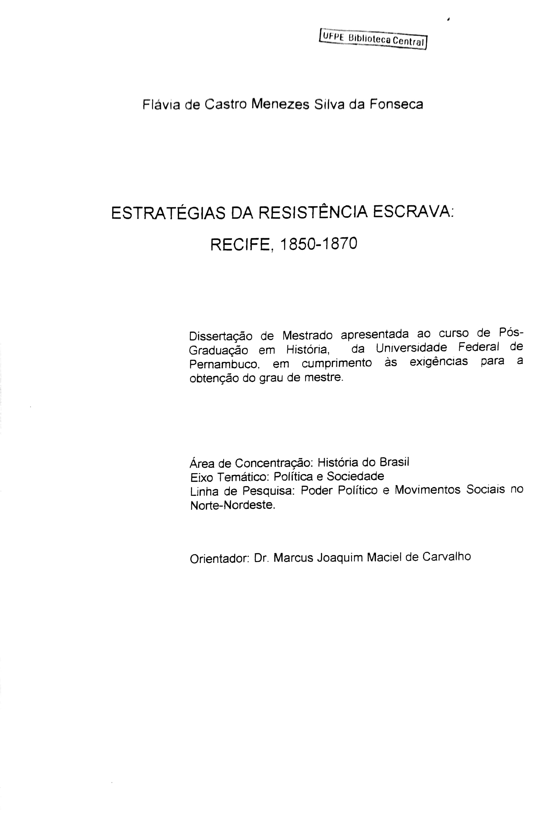 Estratégias de Resistência Escrava: Recife, 1850-1870