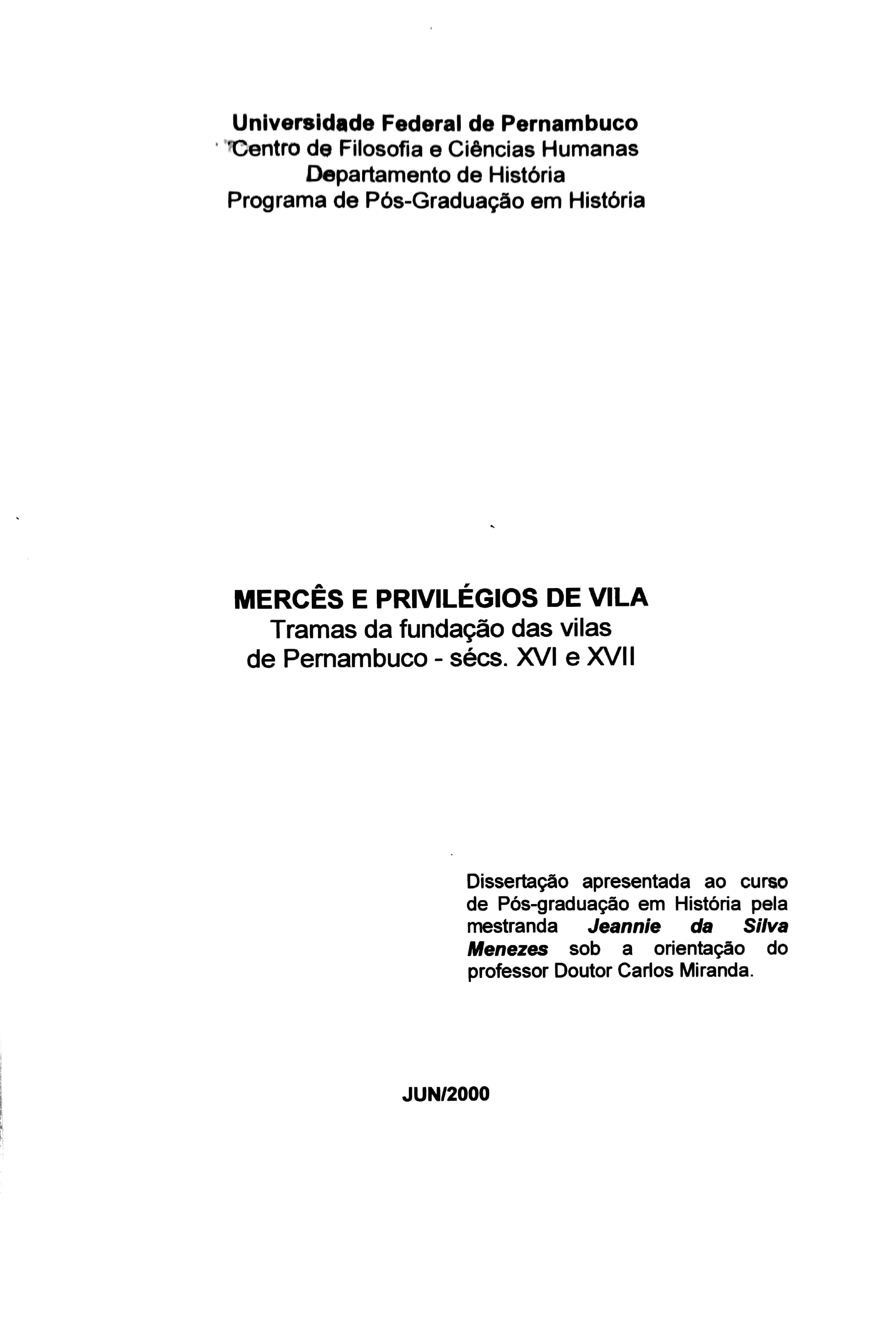 Mercês e Privilégios de Vila: Tramas da Fundação das Vilas de Pernambuco - Sécs. XVI e XVII