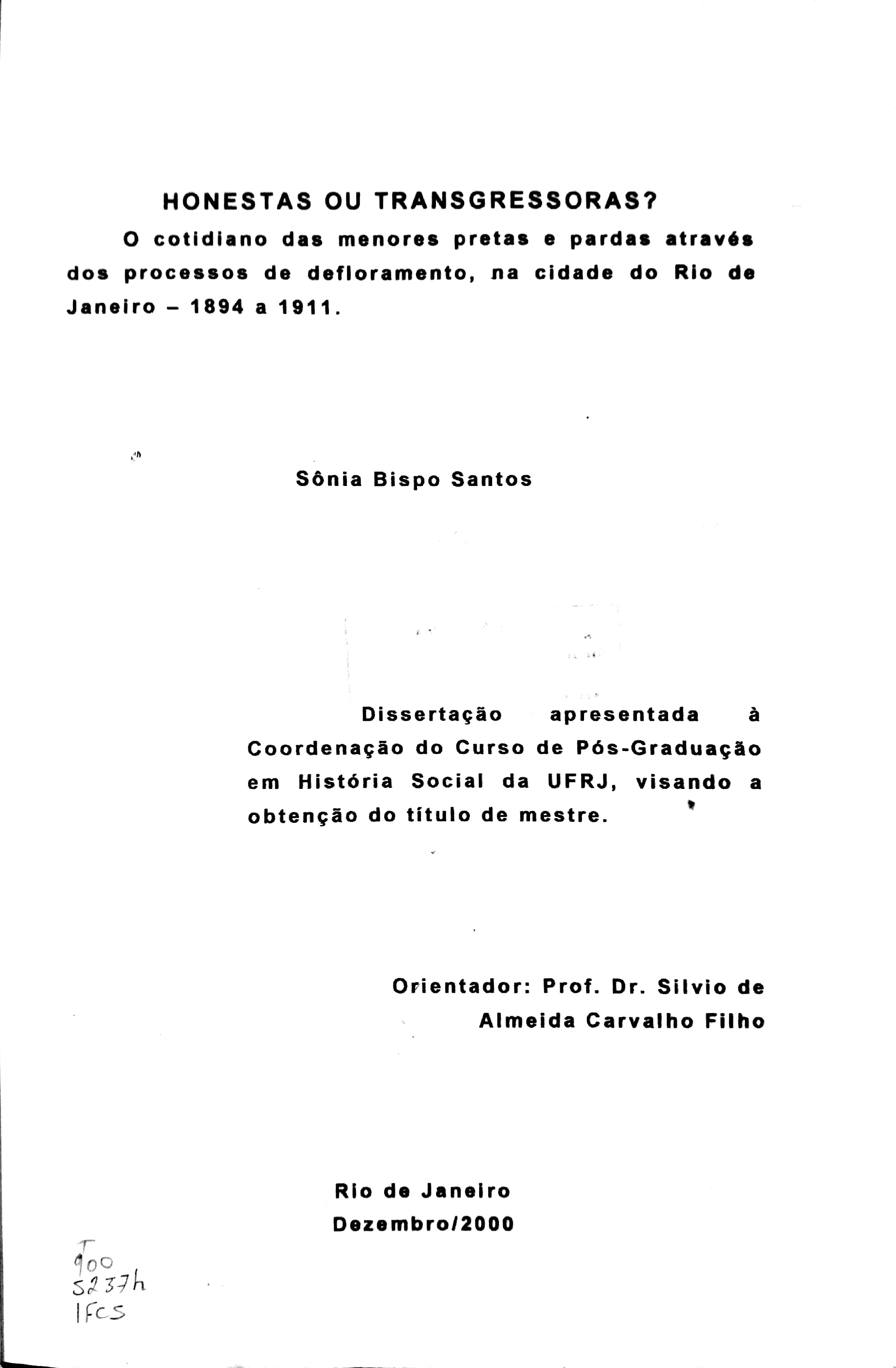 Honestas ou Transgressoras? O Cotidiano das Menores Pretas e Pardas através dos Processos de Defloramento, na Cidade do Rio de Janeiro - 1894 a 1911